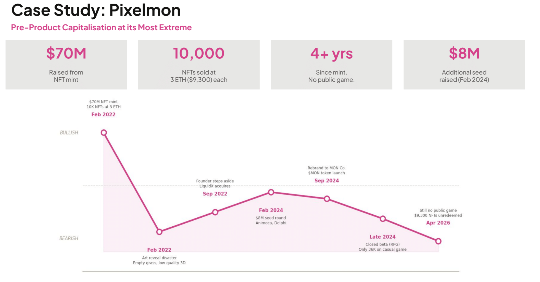 Pixelmon keräsi 70 miljoonaa dollaria helmikuun 2022 myynnissä, mutta neljä vuotta myöhemmin peliä ei ollut julkaistu yleisölle. The Sandbox sai 93 miljoonaa dollaria SoftBankilta, mutta sillä ei ollut koskaan yli 4 500 päivittäistä on-chain-käyttäjää.
