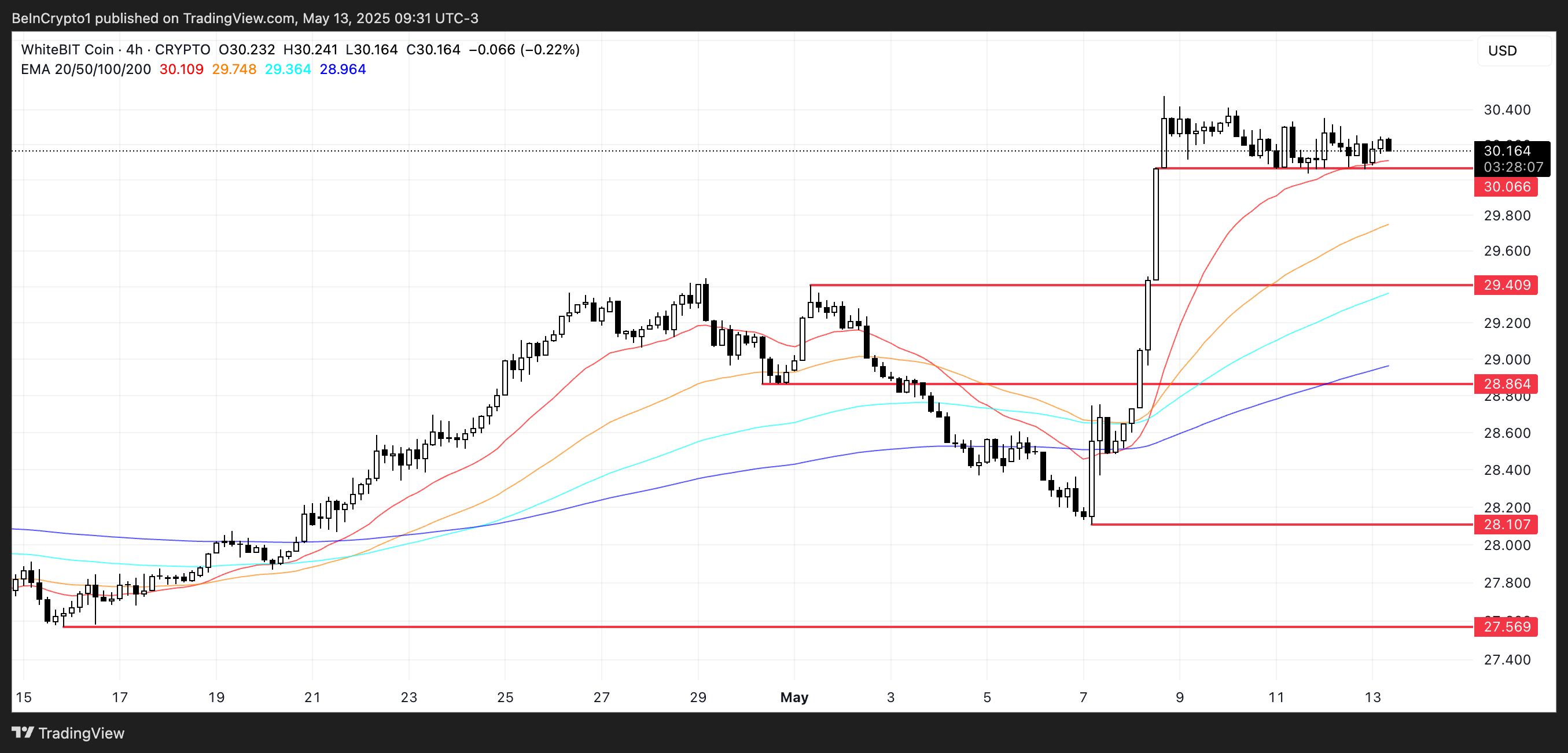 WhiteBIT käy kauppaa lähellä kaikkien aikojen huippujaan, pysyen vakaana neljän päivän hintakonsolidoitumisesta huolimatta. 30,06 dollarin taso on ollut keskeinen tuki tähän mennessä, onnistuneesti estäen laskupaineen.