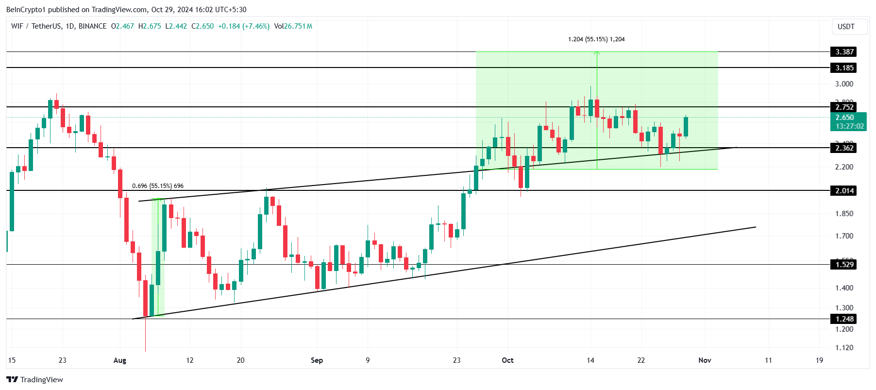 WIF:n nykyinen hinta on 2,65 dollaria ja se kohtaa esteen 2,75 dollarissa. Kun se testaa nousevan kiilan ylärajaa tukena, WIF:llä on realistinen mahdollisuus saavuttaa 55 %:n hintaralli, jos se voi murtautua 2,75 dollarin vastuksen läpi. Tämän tason vahvistaminen tukena voisi mahdollistaa WIF:n jatkuvan nousun.