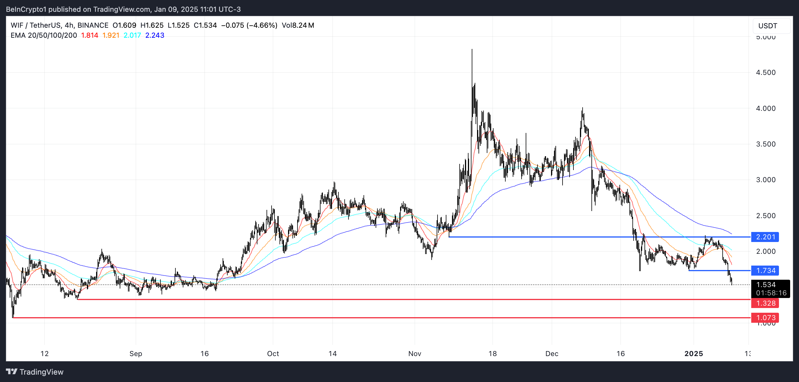 Nykyinen laskutrendi ei osoita laantumisen merkkejä, ja tekniset indikaattorit viittaavat mahdolliseen lisälaskuun. Jos WIF ei vakiinnu, se saattaa pian testata tukea 1,32 dollarissa, ja tämän tason menettäminen voisi laskea sen jopa 1,07 dollariin. Käänne voisi kuitenkin tapahtua, jos markkinatunnelma meemikolikoiden ympärillä paranee, tarjoten WIF:lle mahdollisuuden haastaa vastustasot 1,73 dollarissa ja mahdollisesti nousta takaisin kohti 2,2 dollaria.