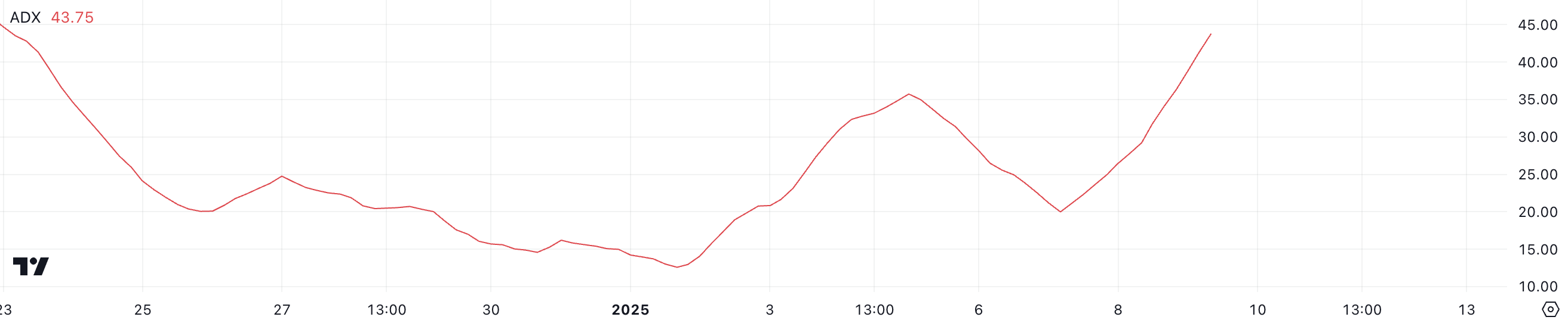 WIF Average Directional Index (ADX) on noussut 43,7:ään, nousten jyrkästi 19,9:stä vain yhdessä päivässä. ADX on tekninen indikaattori, jota käytetään mittaamaan trendin voimakkuutta sen suunnasta riippumatta asteikolla 0–100.