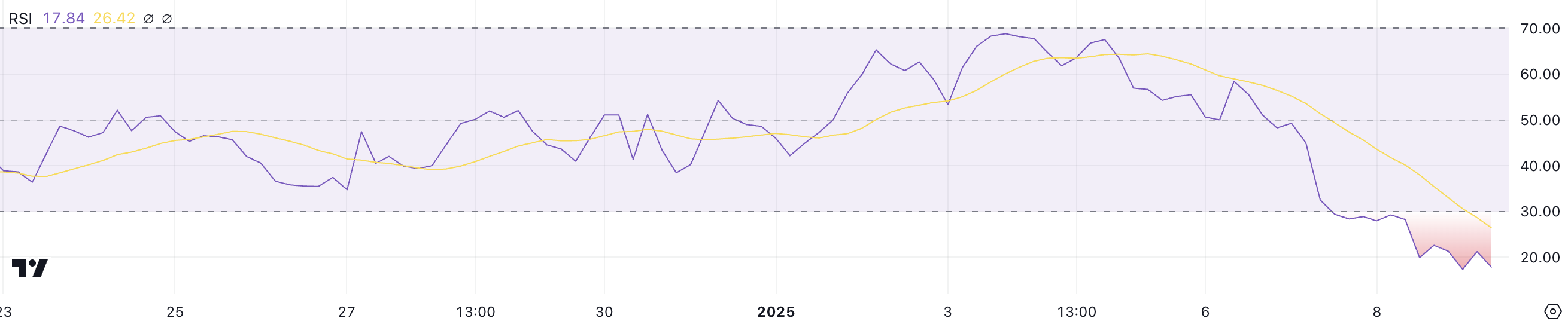 Relative Strength Index (RSI) dogwifhatille on pudonnut 17,8:aan, mikä merkitsee jyrkkää siirtymistä ylimyytyyn alueeseen oltuaan neutraali 20. joulukuuta ja 7. tammikuuta välillä. RSI on laajalti käytetty momentti-indikaattori, joka mittaa hintaliikkeiden nopeutta ja suuruutta asteikolla 0–100.