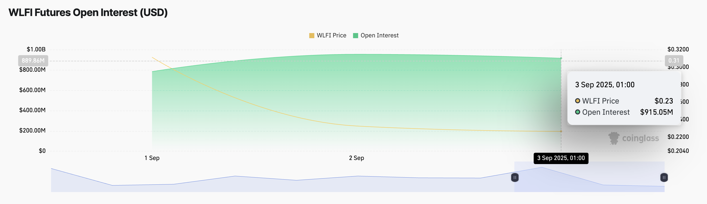 WLFIn hinta notkahdus viimeisen päivän aikana on ollut yhdessä sen futuurien Open Interestin laskun kanssa, mikä vahvistaa markkinaosallistumisen vetäytymisen. Tällä hetkellä 915,05 miljoonaa dollaria, tämä on laskenut 4 % viimeisen 24 tunnin aikana, Coinglassin tietojen mukaan.