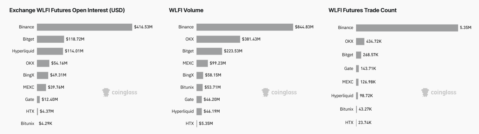 CoinGlassin data osoittaa, että WLFI:n Open Interest nousi 68 % viimeisen päivän aikana 809,3 miljoonaan dollariin, kun taas kaupankäyntivolyymi hyppäsi 141 % 1,76 miljardiin dollariin.