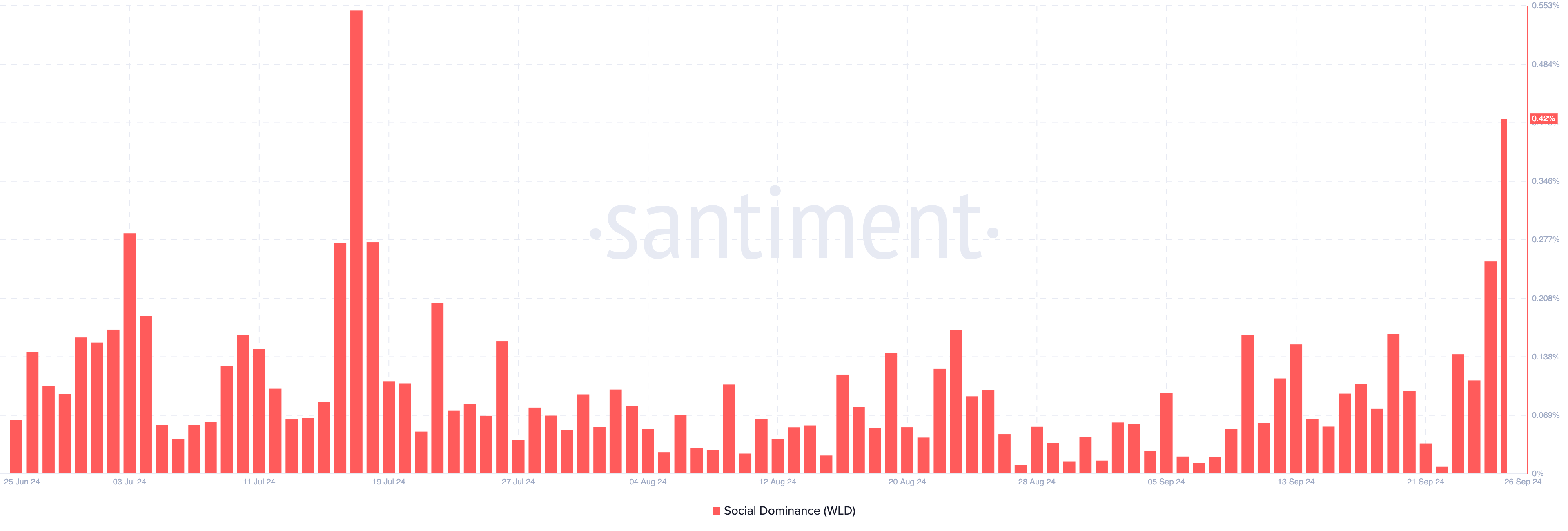 Lisäksi Santimentin ketjuanalyysi osoittaa piikin Worldcoinin sosiaalisessa dominanssissa. Tämä äkillinen kasvu viittaa siihen, että keskustelut Worldcoinista ovat lisääntyneet. Se myös vihjaa, että WLD:n kysyntä saattaa kasvaa, mikä voisi edistää hintojen nousua entisestään.