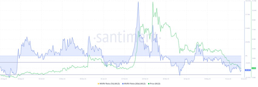 Toiseksi markkina-arvon ja toteutuneen arvon (MVRV) suhde on myös tällä hetkellä mahdollisuusvyöhykkeellä. MVRV-suhde arvioi sijoittajan voittoa ja tappiota. Tällä hetkellä Worldcoinin 30 päivän MVRV on -28 %, mikä tarkoittaa tappioita, mikä voi laukaista ostopaineen.