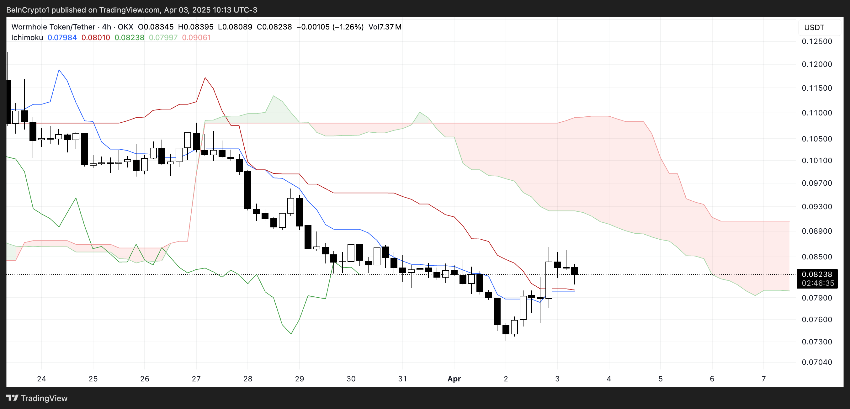 Wormholen Ichimoku Cloud -kaavio osoittaa sekalaista näkymää. Hintakehitys yrittää murtautua vastuksen läpi, mutta kohtaa edelleen merkittäviä vastatuulia.