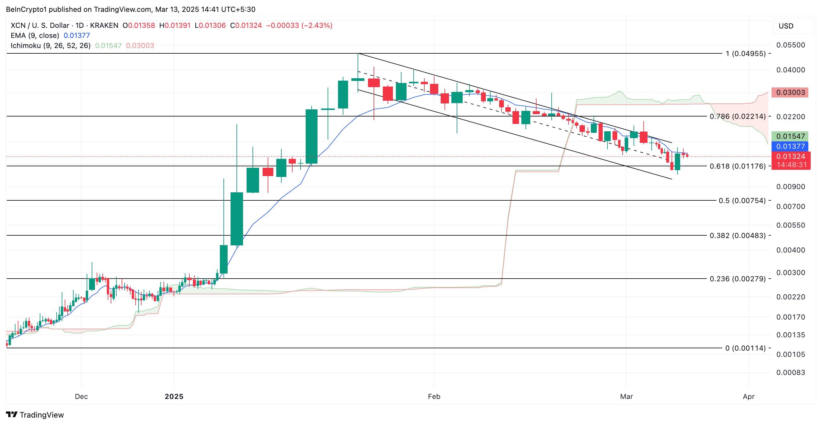 XCN:n tapauksessa sen Ichimoku Cloud muodostaa dynaamisen vastuksen sen hinnan yläpuolella 0,0154 ja 0,0300 dollarissa, mikä korostaa voimakasta alaspäin kohdistuvaa painetta kolikon hinnassa.