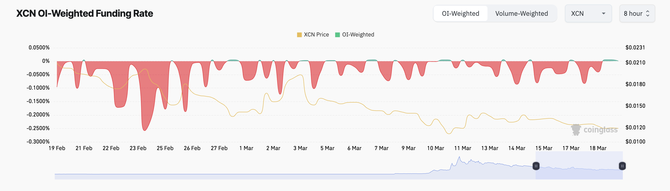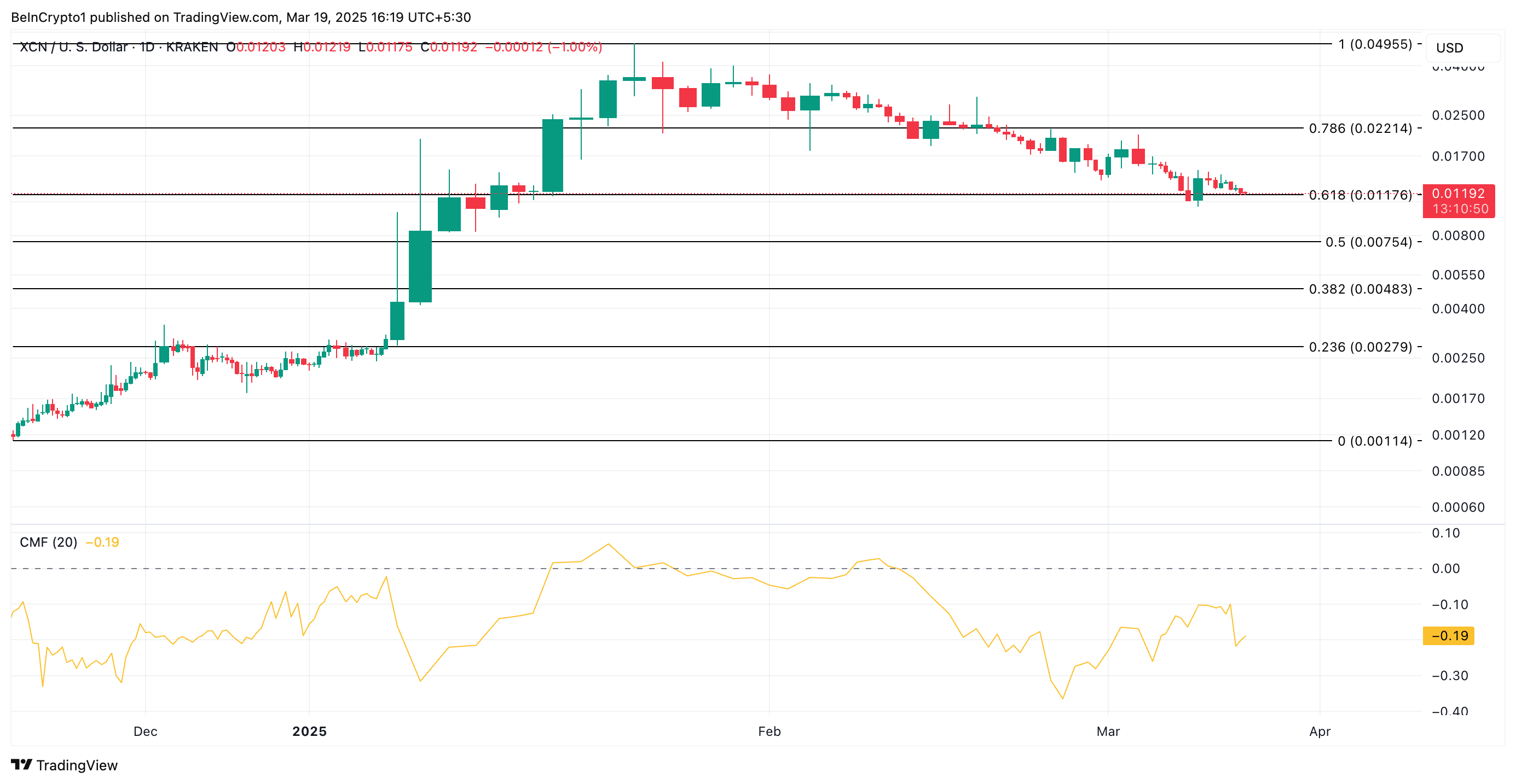 CMF-indikaattori mittaa rahavirtoja omaisuusvaraan ja siitä pois. Kun sen arvo on negatiivinen, myyntipaine ylittää ostotoiminnan. Tämä viittaa siihen, että hinnan lasku on todennäköinen, kun kysyntä pysyy heikkona. Tässä tilanteessa XCN:n hinta voisi laskea 0,0075 dollariin.