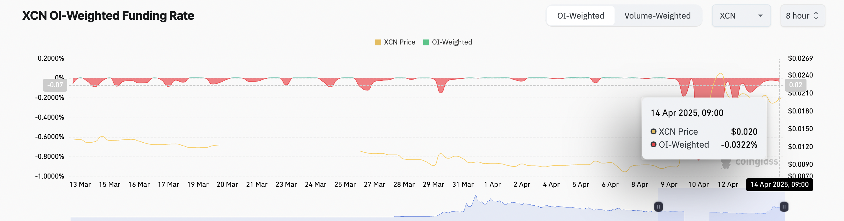 Tammikuussa saavutettuaan paikallisen syklin huipun 0,049 dollarissa, XCN siirtyi laskutrendiin, menettäen merkittävästi arvoaan seuraavien kuukausien aikana. Lasku huipentui jyrkkään pudotukseen 0,007 dollariin 7. huhtikuuta. Tämä merkitsi kuitenkin käännekohtaa.