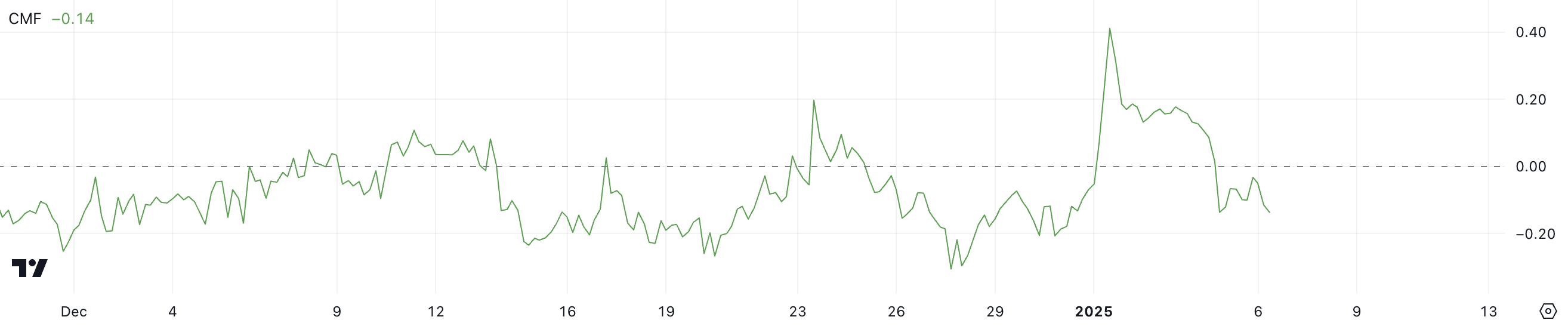 Chaikin Money Flow (CMF) XLM:lle on tällä hetkellä -0,14, mikä merkitsee merkittävää muutosta sen huipusta 0,41 tammikuun 1. päivänä, joka oli sen korkein arvo vuoteen. CMF mittaa rahan virtausta omaisuusvaraan hinnan ja volyymin perusteella, ja arvot yli 0 osoittavat nettomääräistä ostopainetta, kun taas arvot alle 0 viittaavat nettomääräiseen myyntipaineeseen.