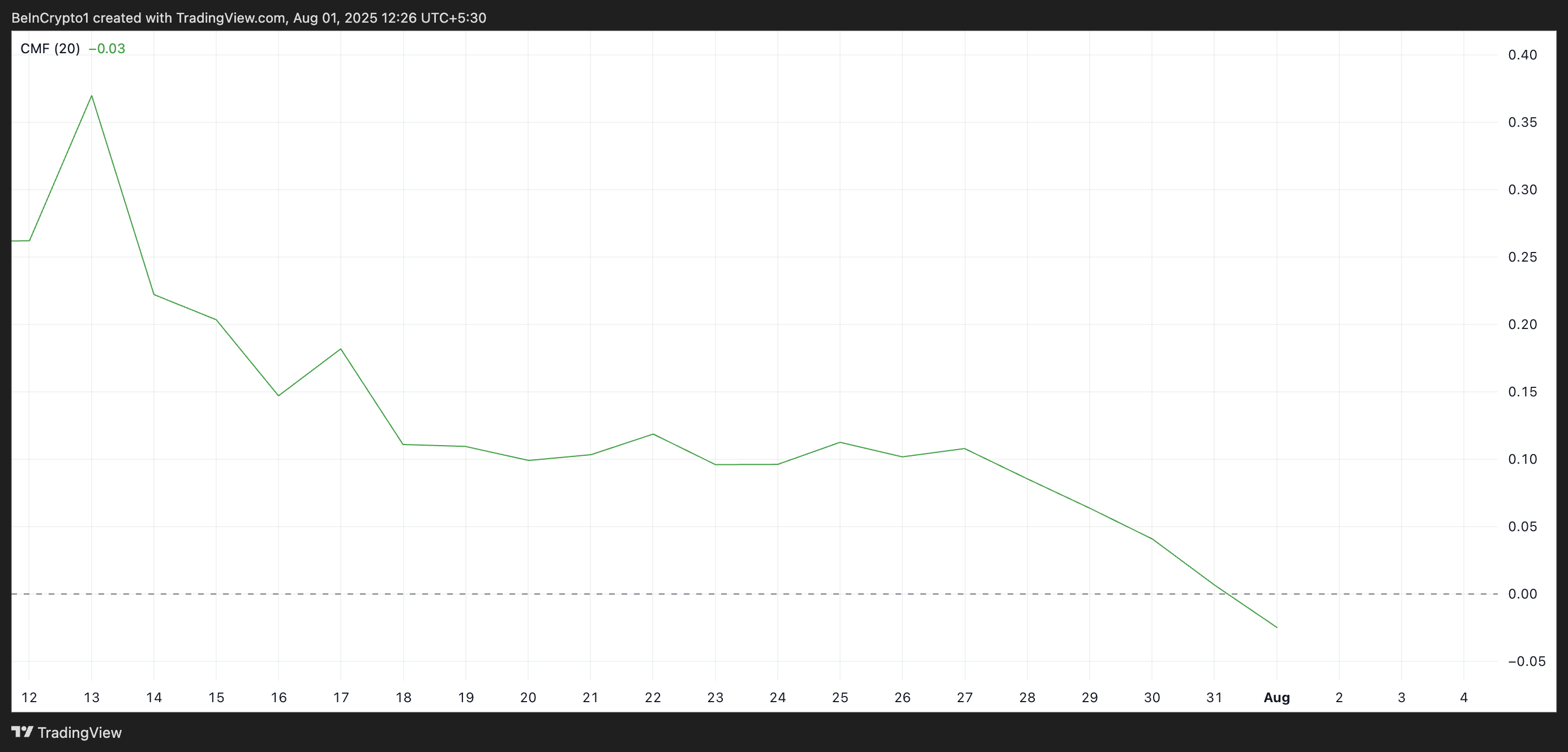 Tätä laskunäkymää vahvistaa se, että XLM:n Chaikin Money Flow (CMF) on laskenut nollaviivan alapuolelle—toinen varoitusmerkki, joka viittaa jatkuvaan laskuun elokuussa. CMF-lukema on -0,03 kirjoitushetkellä, mikä osoittaa nettokapitalin ulosvirtausta XLM:n spot-markkinoilta.