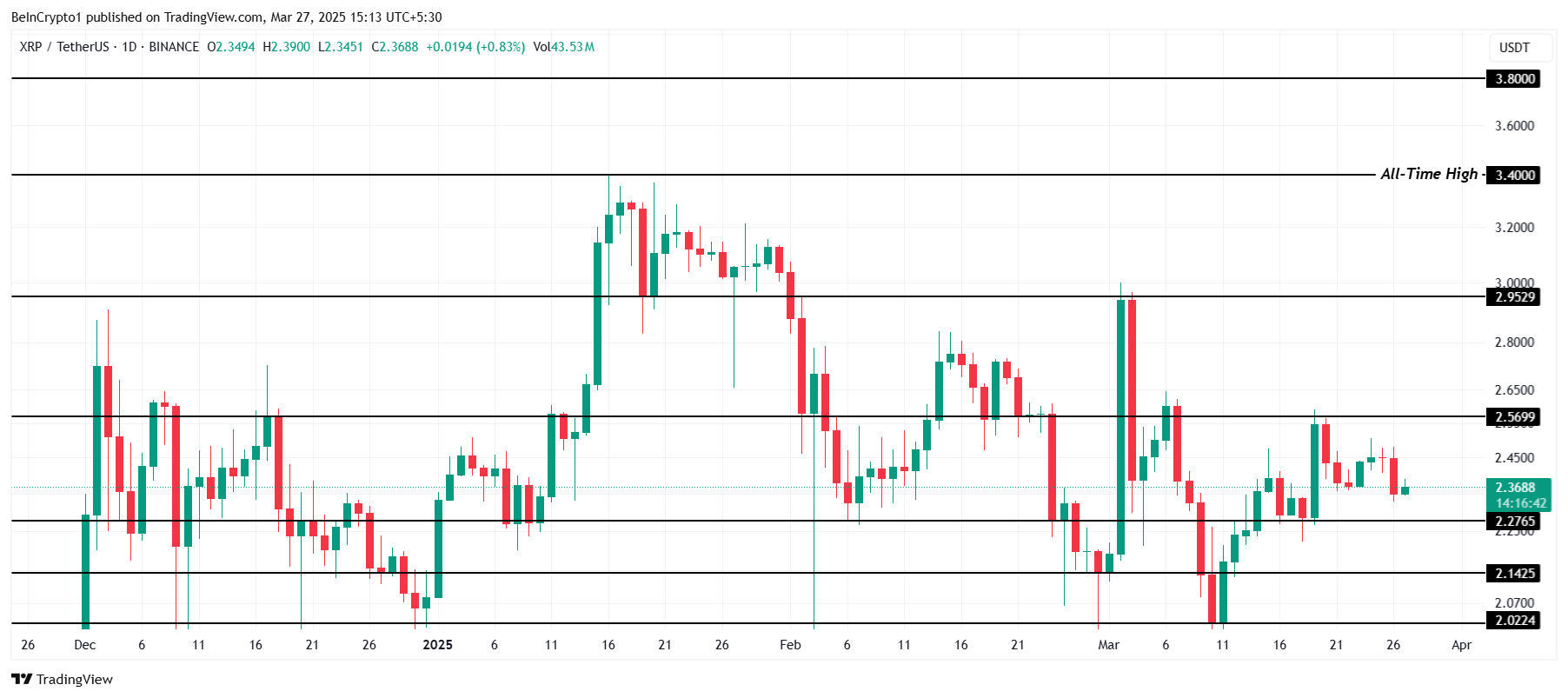 XRP:n hinta on tällä hetkellä 2,36 dollaria, eikä se pysty murtamaan kriittistä 2,56 dollarin vastustustasoa. Tämä vastus on ollut merkittävä este altcoinille aiemmin, ja se jatkaa vahvana kiistakohtana. Kunnes XRP onnistuu ylittämään tämän tason, altcoin ei todennäköisesti ylläpidä merkittävää hintarallia.