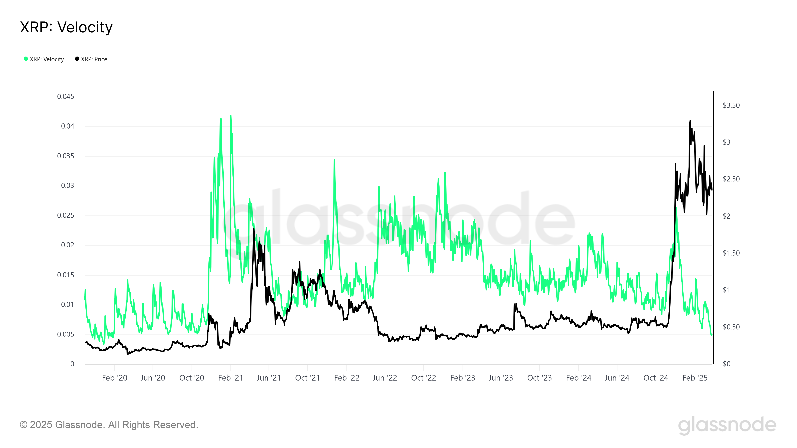 XRP:n liikkeessä oleva määrä on kokenut jyrkän laskun, ja sen nopeus on pudonnut viiden vuoden alimmalle tasolle. Tämä tunnusluku, joka seuraa XRP:n transaktioiden nopeutta, ei ole ollut näin alhainen sitten tammikuun 2020. Liikkeessä olevan määrän lasku heijastaa usein sijoittajien epäröintiä, sillä vähäinen liike viittaa luottamuksen puutteeseen markkinoilla.