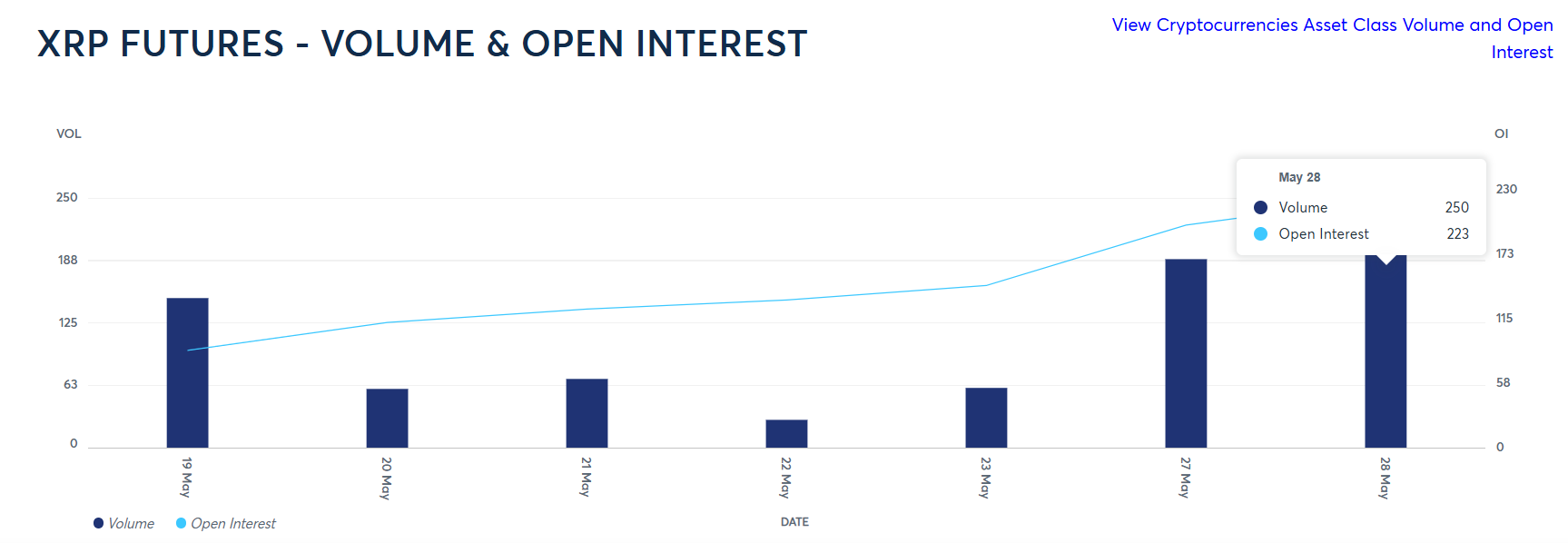 Kysyntä XRP:lle on kasvanut voimakkaasti futuurimarkkinoilla, ja XRP CME Futures Open Interest on saavuttanut 223 miljoonaa dollaria vain 10 päivässä sen lanseerauksesta. Tämä nopea Open Interestin kasvu on yleensä karhumainen merkki, sillä kauppiaat todennäköisesti asettavat lyhyitä sopimuksia.