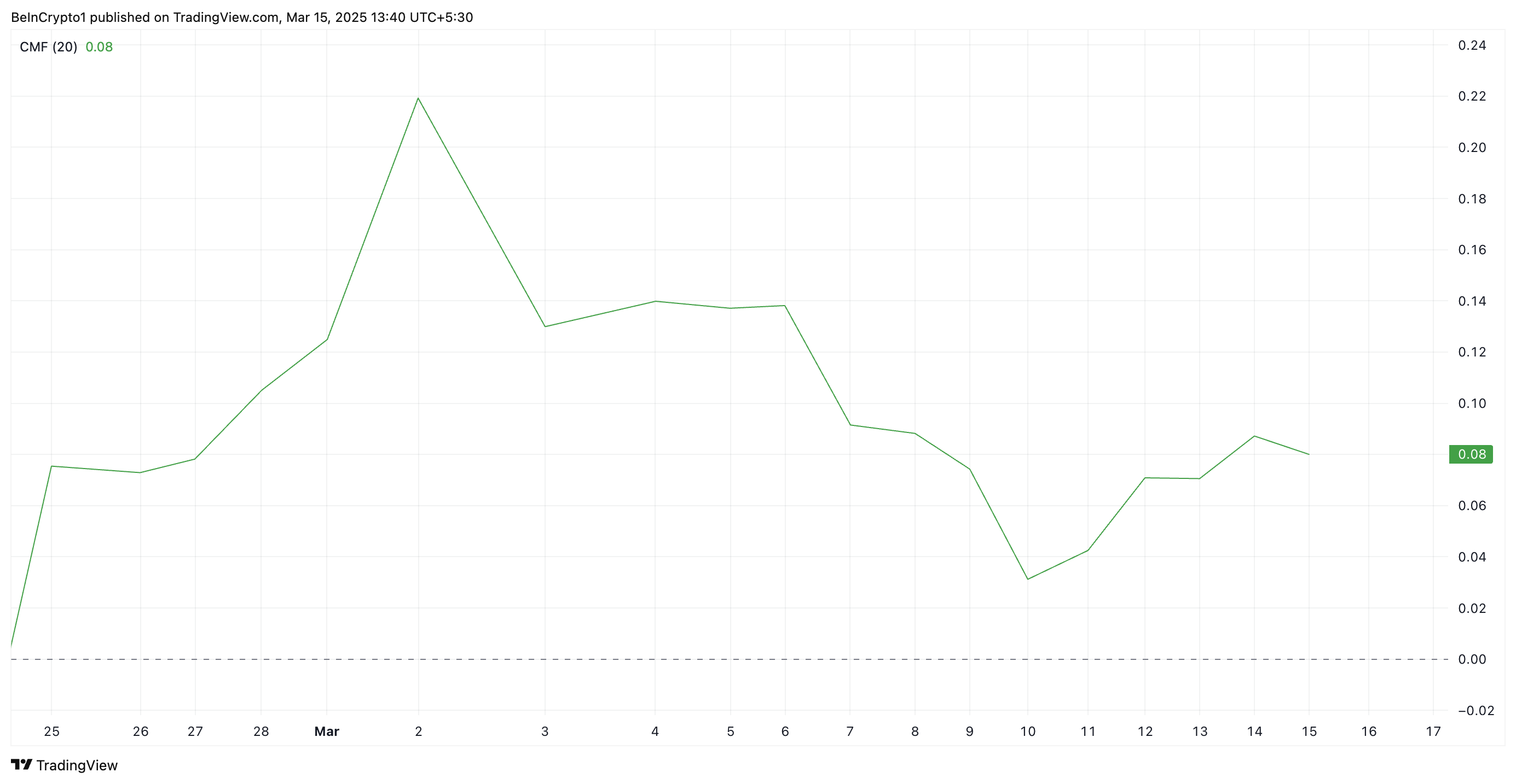 Lisäksi altcoinin nouseva Chaikin Money Flow (CMF) osoittaa pääoman virtausta XRP:n spot-markkinoille. Tällä hetkellä tämä tunnusluku, joka seuraa rahan liikkeitä omaisuusvaraan, on yli nollan, 0,08.