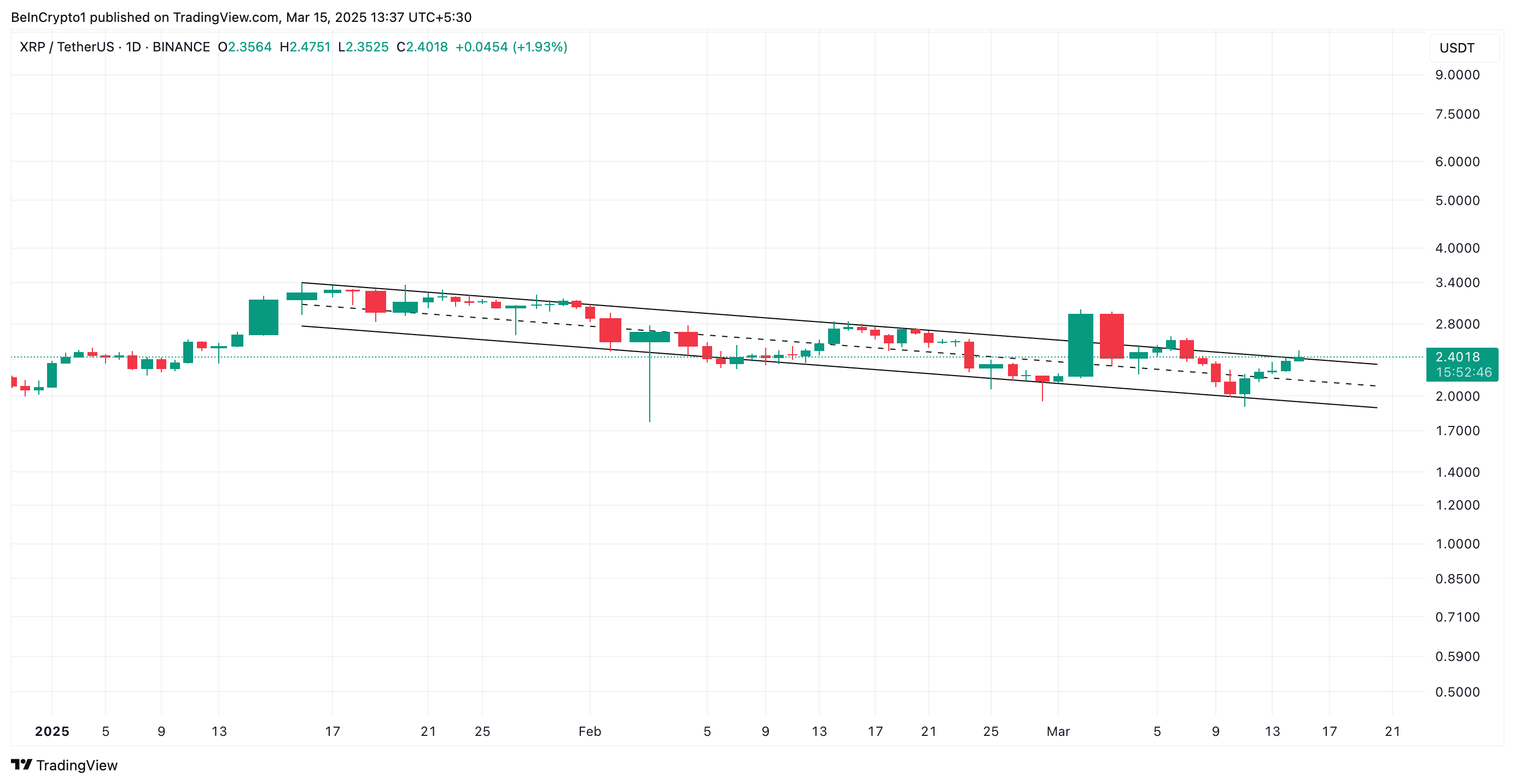 Toisaalta, jos voittojen kotiuttaminen jatkuu, XRP voi menettää viimeaikaiset nousunsa ja pudota takaisin laskevaan rinnakkaiskanavaan. Tässä tilanteessa altcoin voisi käydä kauppaa 2,13 dollarilla.