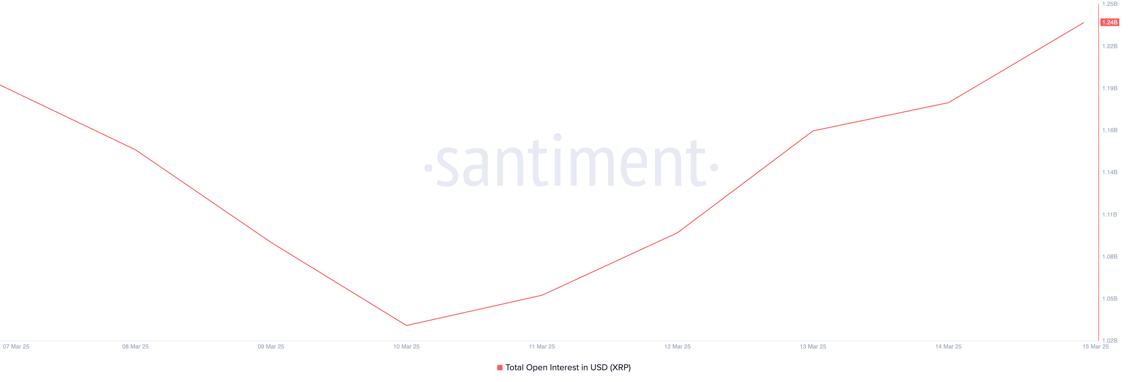 Lisäksi tokenin nouseva open interest sen futuurimarkkinoilla heijastaa XRP:n kysynnän elpymistä. Tämä on tällä hetkellä 1,24 miljardia dollaria, noussut 20 % viimeisten viiden päivän aikana, jolloin XRP:n hinta on noussut 13 %.