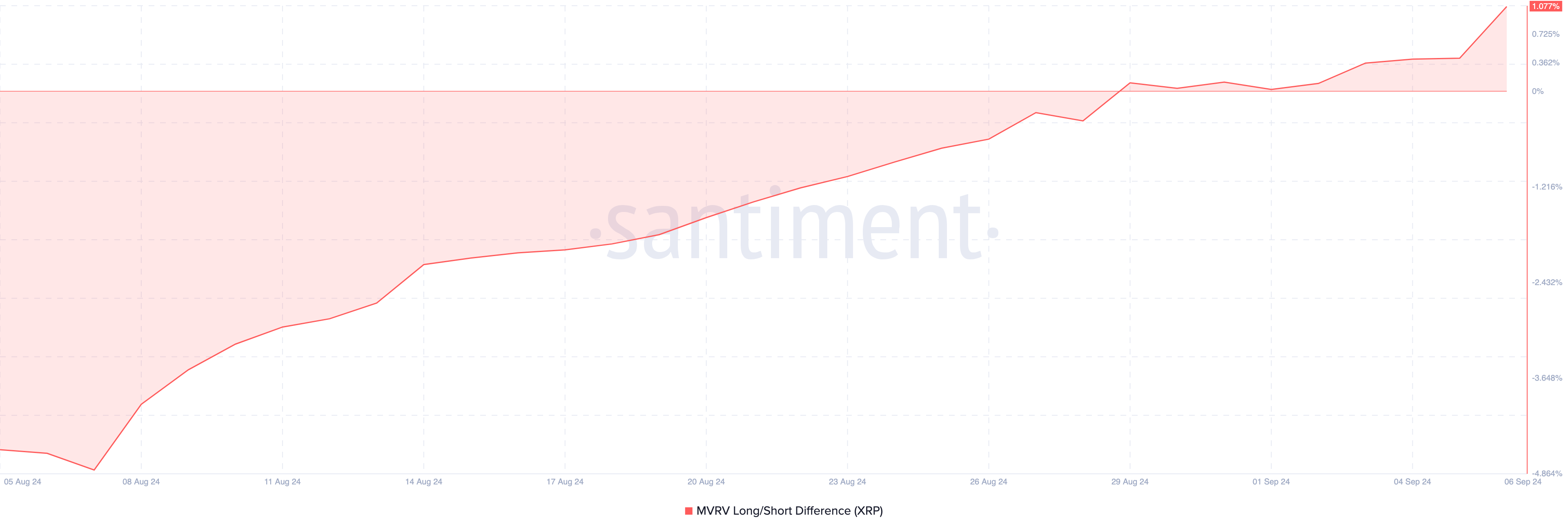 Toinen tätä kantaa tukeva indikaattori on XRP:n markkina-arvon ja toteutuneen arvon (MVRV) pitkä/lyhyt-ero. Tämä tunnusluku osoittaa, tekevätkö lyhytaikaiset haltijat enemmän voittoja kuin pitkäaikaiset haltijat.