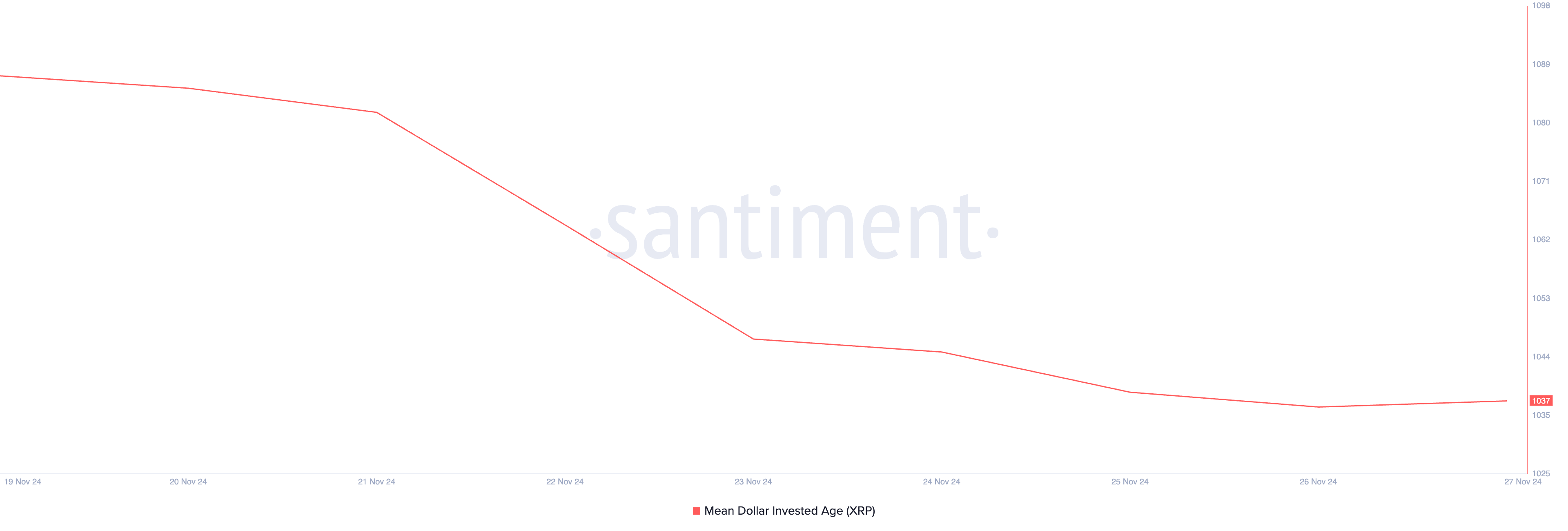Mittari seuraa kaikkien omaisuuteen sijoitettujen dollarien keski-ikää, mikä heijastaa sitä, kuinka kauan tokeneita on pidetty lompakoissa. Jos se putoaa, osoittaa se lisääntynyttä verkkotoimintaa, kun vanhempia kolikoita siirretään tai käytetään.