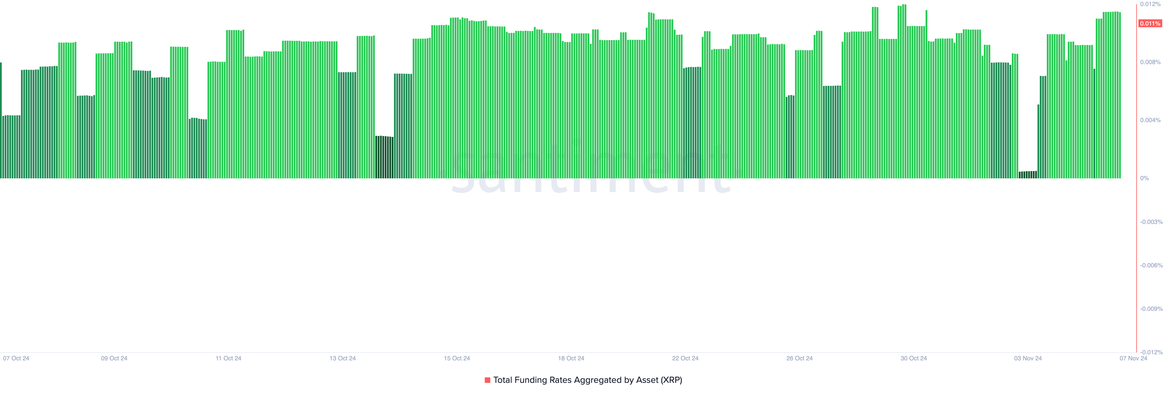 Etenkin tämä härkämäinen näkymä on olemassa myös XRP:n johdannaismarkkinoilla, kuten sen positiivinen rahoitusaste osoittaa, joka on 0,011 % tätä kirjoitettaessa. Rahoitusaste on mekanismi, jota käytetään jatkuvissa futuurisopimuksissa varmistamaan, että sopimuksen hinta pysyy linjassa omaisuusvaran perushinnan kanssa.