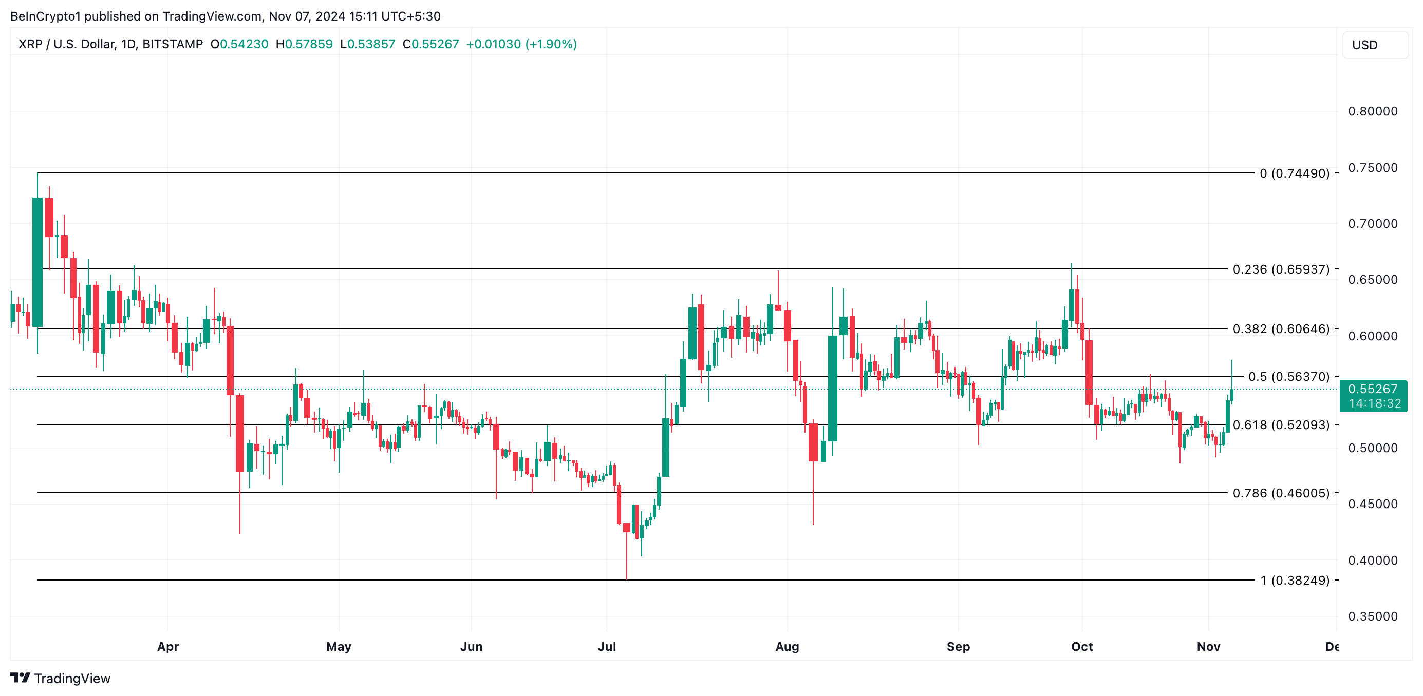 Jos nykyinen markkinamomentum jatkuu, XRP on valmis murtamaan 0,56 dollarin vastustustason lähiaikoina. Onnistunut murtuminen asettaisi sen kohti 0,60 dollarin tasoa, joka saavutettiin viimeksi lokakuun alussa.