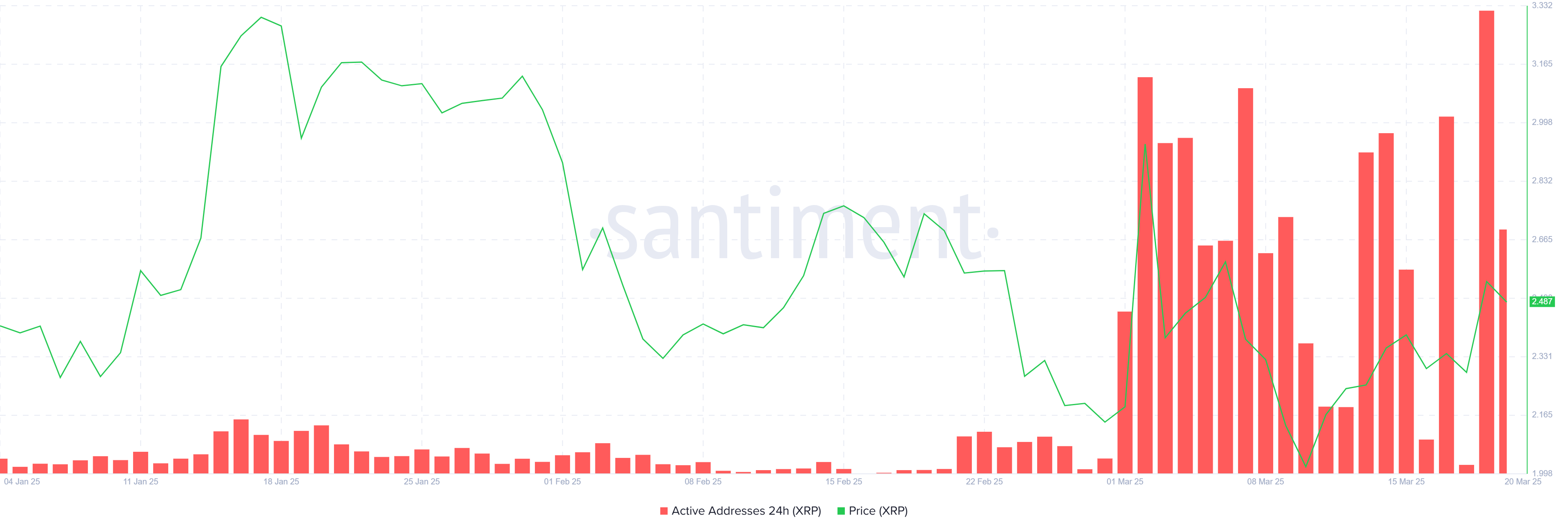 Aktiiviset osoitteet XRP-verkossa ovat pysyneet erityisen korkeina koko maaliskuun ajan, mikä viittaa lisääntyneeseen sijoittajien osallistumiseen, keskimäärin 363 000. Tämä jatkuva aktiivisuus on selvä merkki siitä, että sijoittajien tunnelma on muuttunut positiivisemmaksi verrattuna tammikuuhun ja helmikuuhun.