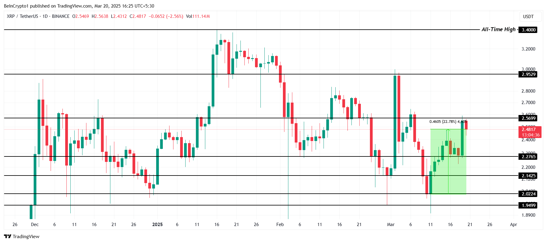 Jos XRP ei onnistu murtamaan 2,56 dollarin vastusta, se voi kohdata vetäytymisen 2,27 dollariin. Tuen menettäminen 2,27 dollarissa mitätöisi härkämäisen näkymän, ja hinta laskisi 2,14 dollariin.