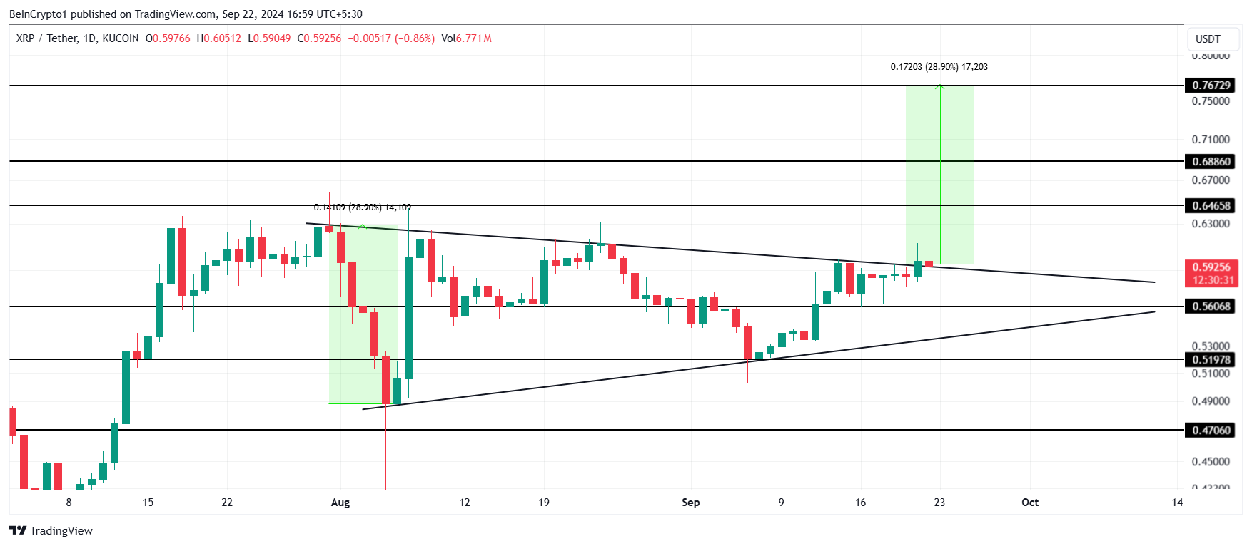 XRP testaa tällä hetkellä symmetrisen kolmion kuvion yläpuolella olevaa trendiviivaa tukena, mikä viittaa siihen, että murtuma saattaa olla tulossa. Jos murtuma tapahtuu, XRP:n hinta voisi nousta 29 %, työntäen hinnan 0,76 dollariin.