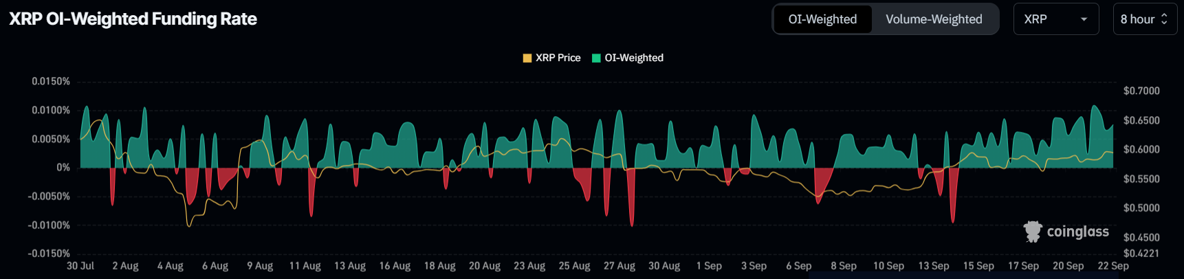 XRP:n kauppiaat ovat yhä härkämäisempiä potentiaalisen rallin suhteen, kuten positiivinen rahoituskorko osoittaa. Nykyinen positiivisten rahoituskorkojen jakso on pisin, jonka XRP on kokenut yli seitsemään viikkoon. Positiivinen rahoituskorko yleensä viestii, että pitkät sopimukset hallitsevat lyhyitä sopimuksia, heijastaen vahvaa markkinatunnelmaa nousevien hintojen puolesta.