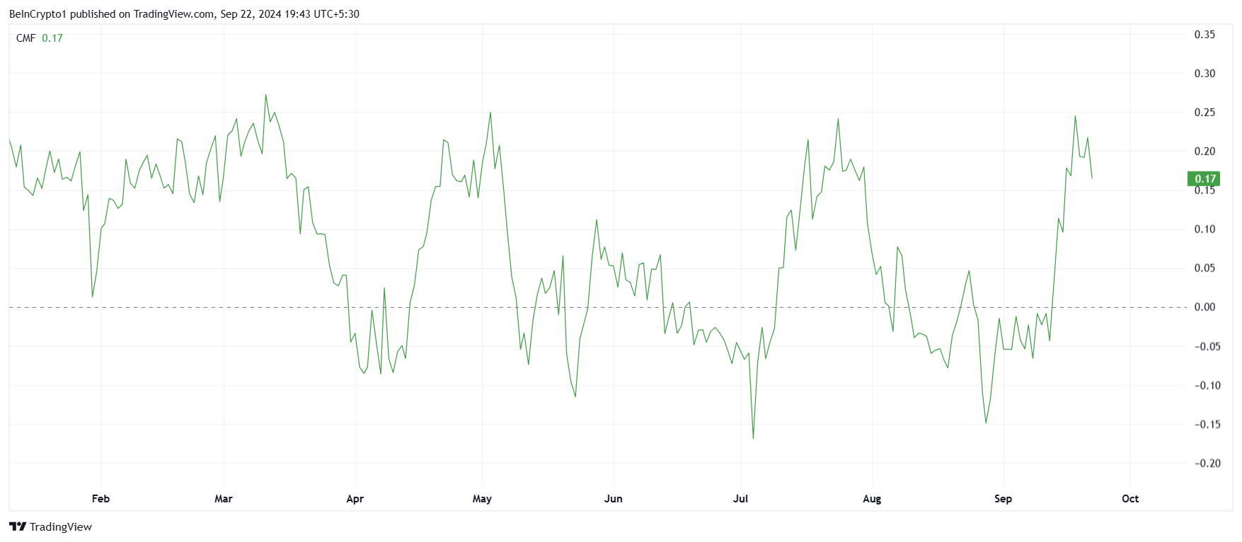 Laajempi liikehdintä XRP:ssä osoittaa myös positiivisia merkkejä. Chaikin Money Flow (CMF) -indikaattori, joka seuraa pääoman virtausta omaisuusvaraan ja siitä pois, on huomannut jyrkän nousun. Nousu viestii, että sijoittajat sijoittavat rahaa XRP:hen, mikä heijastaa luottamusta omaisuusvaran kasvupotentiaaliin.