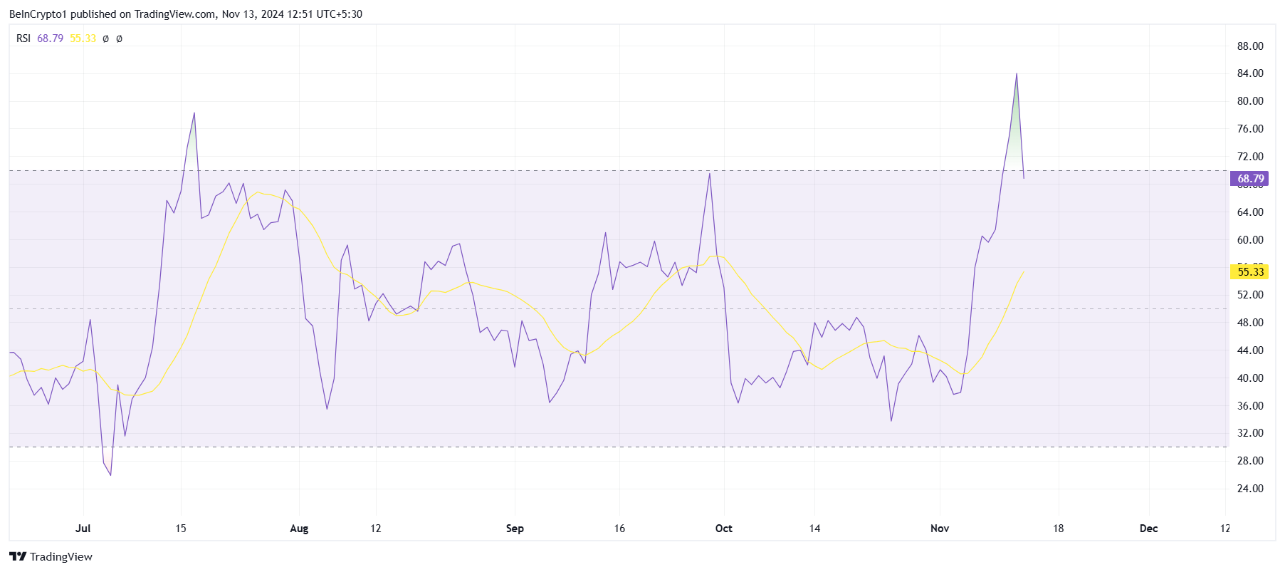 XRP:n makrotason liikehdintä on linjassa karhumaisten signaalien kanssa, sillä Relative Strength Index (RSI) on ollut yliostetussa vyöhykkeessä. Historiallisesti, kun XRP:n RSI saavuttaa tämän alueen, se usein laukaisee käänteen, kun härkämäinen tunnelma saavuttaa kyllästymispisteen. RSI:n läsnäolo tässä vyöhykkeessä vahvistaa äskettäisen myyntisignaalin, tukien lähiaikojen hintalaskun todennäköisyyttä.