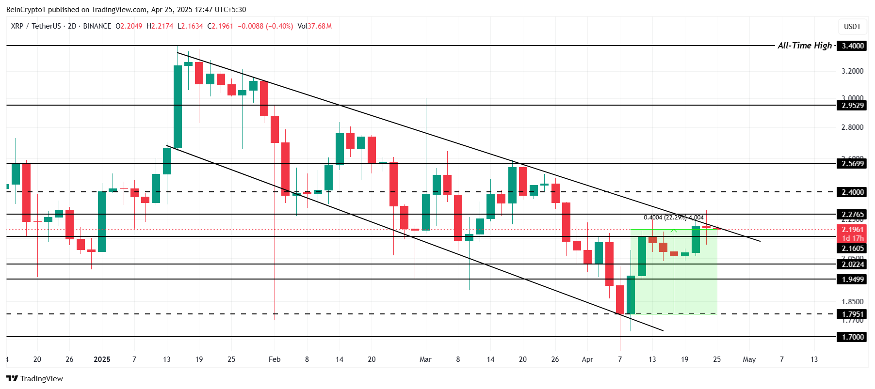XRP käy tällä hetkellä kauppaa hintaan 2,19 dollaria, mikä osoittaa 22 % nousua viimeisten kahden viikon aikana. Altcoin näyttää valmistautuvan läpimurtoon kolmen kuukauden vanhasta laskevasta kanavasta. Tämä läpimurto kohtaa kuitenkin haasteita, sillä yliarvostus ja laajemmat markkinaindikaattorit viittaavat siihen, että hintaralli ei välttämättä kestä.