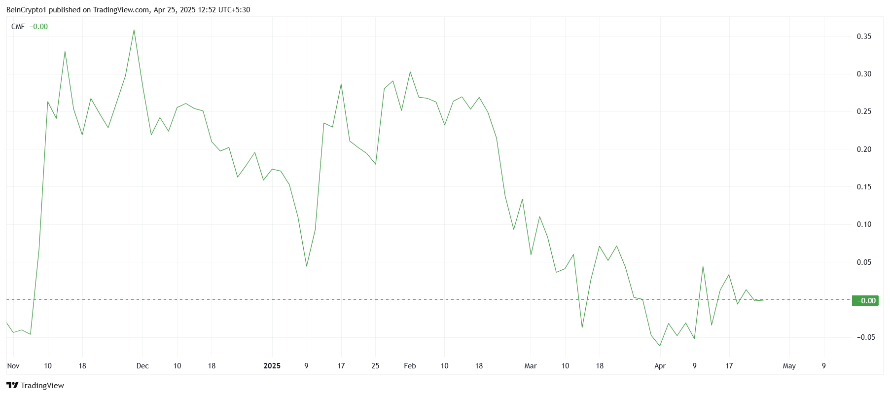 Huolimatta siitä, että XRP on noussut 22 % viimeisten kahden viikon aikana, tekniset indikaattorit maalaavat huolestuttavamman kuvan. Chaikin Money Flow (CMF) -indikaattori on osoittanut merkittävää piikkiä, mikä usein viittaa siihen, että rahaa virtaa markkinoille. Tarkempi tarkastelu sijoitusten volyymiin paljastaa kuitenkin, että merkittävä ostotoiminta ei ole tukenut hinnan nousua.
