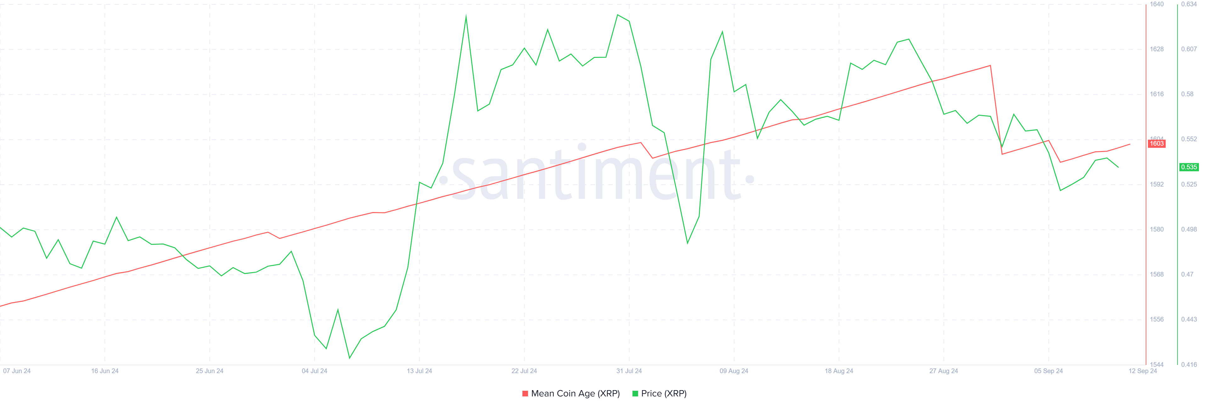 Laajemmassa katsannossa Mean Coin Age (MCA) -tunnusluku antaa tietoa XRP:n omistajien käyttäytymisestä. Elokuun lopussa ja syyskuun alussa MCA osoitti laskua, mikä viittaa XRP:n liikkuvuuteen osoitteiden välillä, mikä on karhumainen merkki. Viime viikolla MCA on kääntynyt nousuun, mikä puolestaan viittaa siihen, että pitkäaikaiset omistajat ovat jälleen päättäneet HODLata eivätkä liikuttaa XRP:tään.