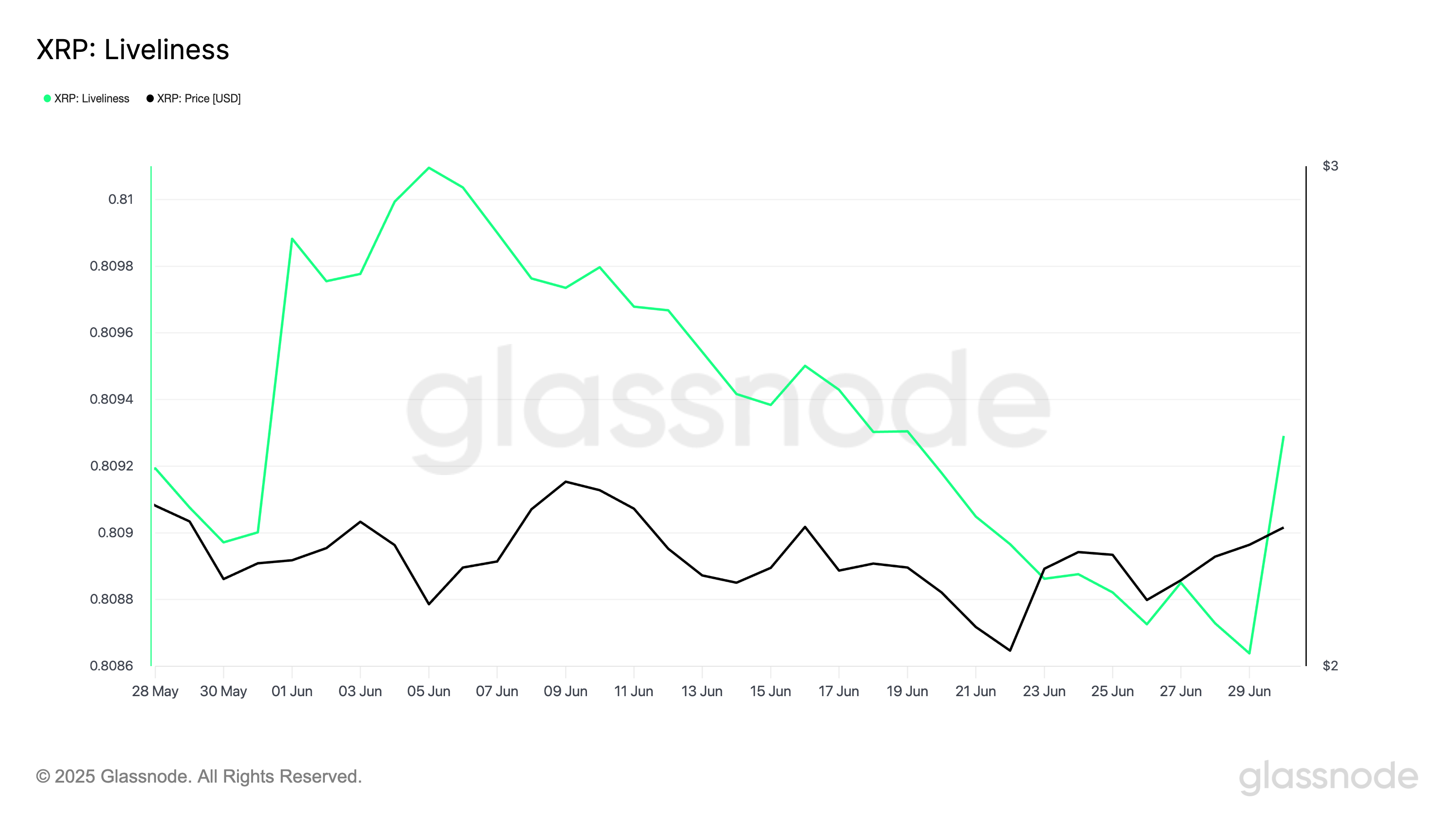 Lisäksi, tasaisen laskun jälkeen, joka alkoi 5. kesäkuuta, XRP:n Liveliness kääntyi äkillisesti eilen, nousten 0,809:ään.