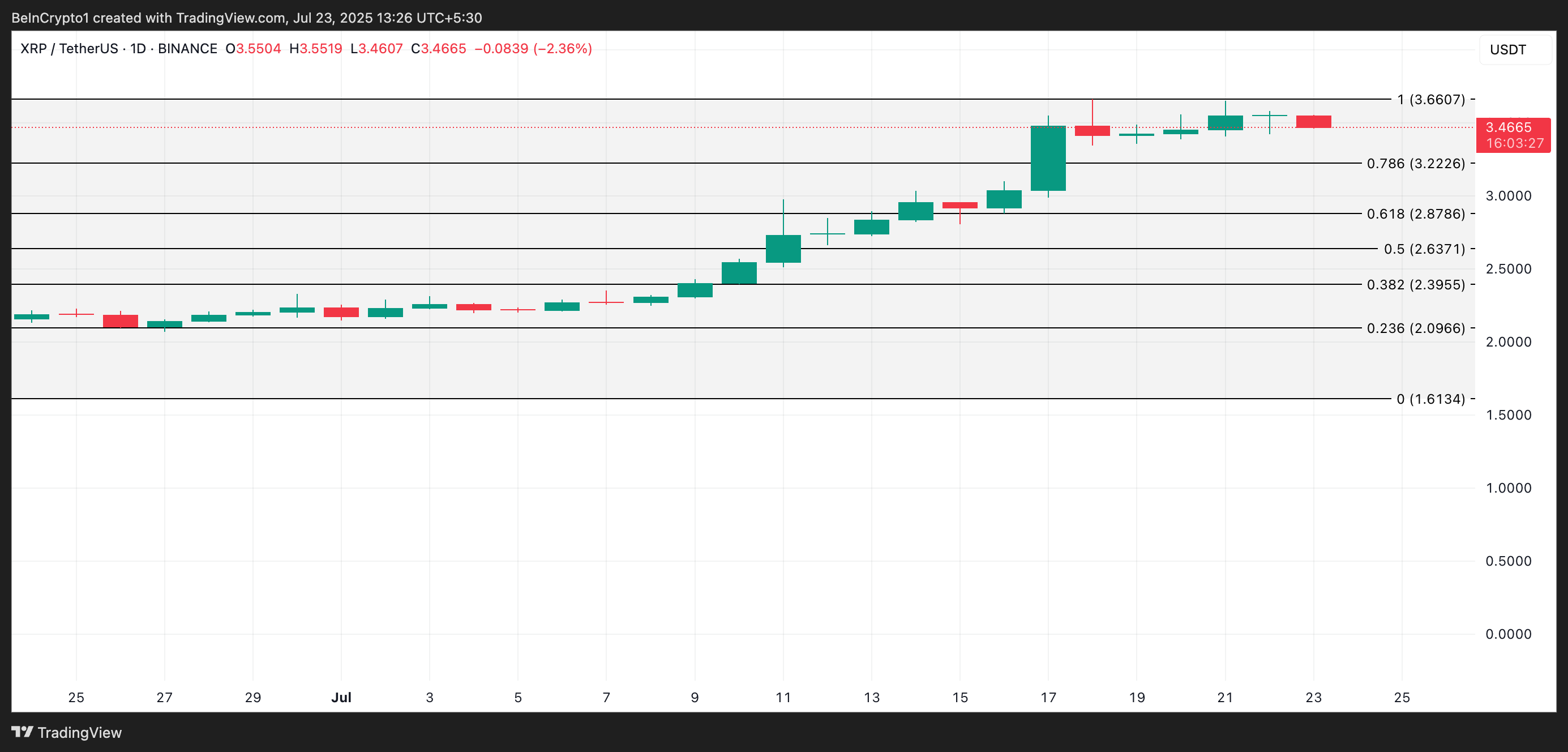 Kirjoitushetkellä XRP:n hinta on 3,47 dollaria, juuri alle sen kaikkien aikojen korkeimman 3,66 dollarin. Kuitenkin kasvava myyntipaine lisää lyhyen aikavälin korjauksen todennäköisyyttä kohti 3,22 dollarin tukitasoa.