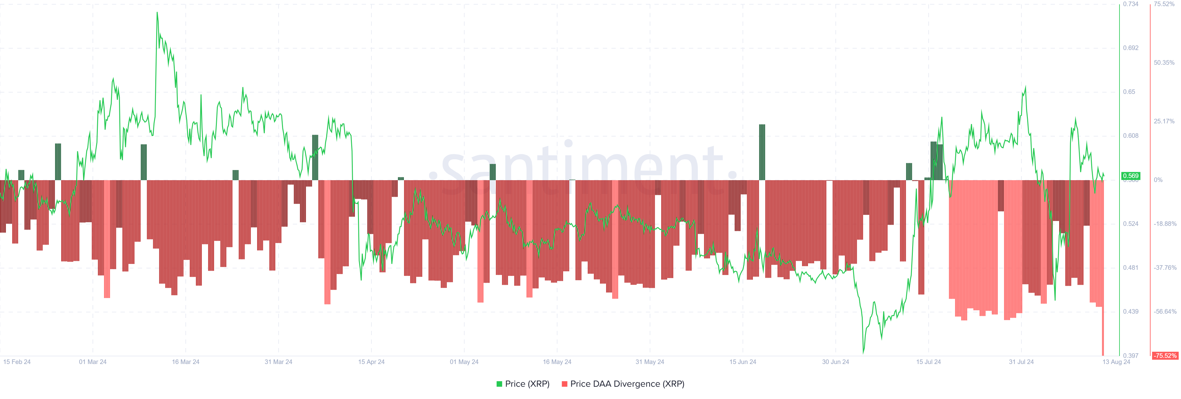 Päivittäisen aktiivisen osoitteen (DAA) hajonta paljastaa myös myyntisignaaleja, mikä saattaa johtaa lisääntyneeseen osallistumiseen myyntitoimintaan. Tämä hajonta korostaa ostokiinnostuksen heikkenemistä suhteessa myyntipaineeseen.