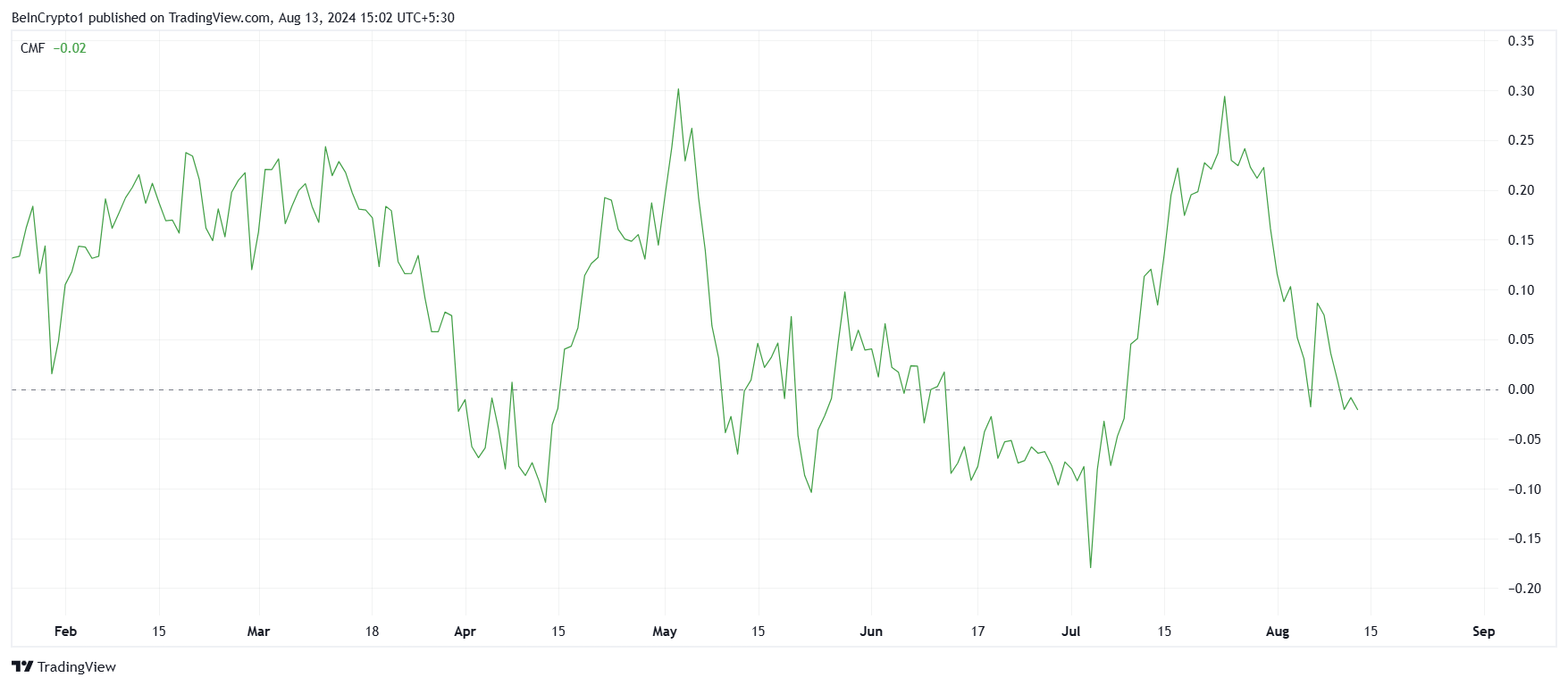 XRP:n hinta on jo osoittamassa karhumaisuutta, mikä saattaa voimistua edelleen negatiivisten signaalien ilmaantuessa. XRP:n Chaikin Money Flow (CMF) osoittaa, että ulosvirtaukset ovat kuukauden korkeimmalla tasolla.