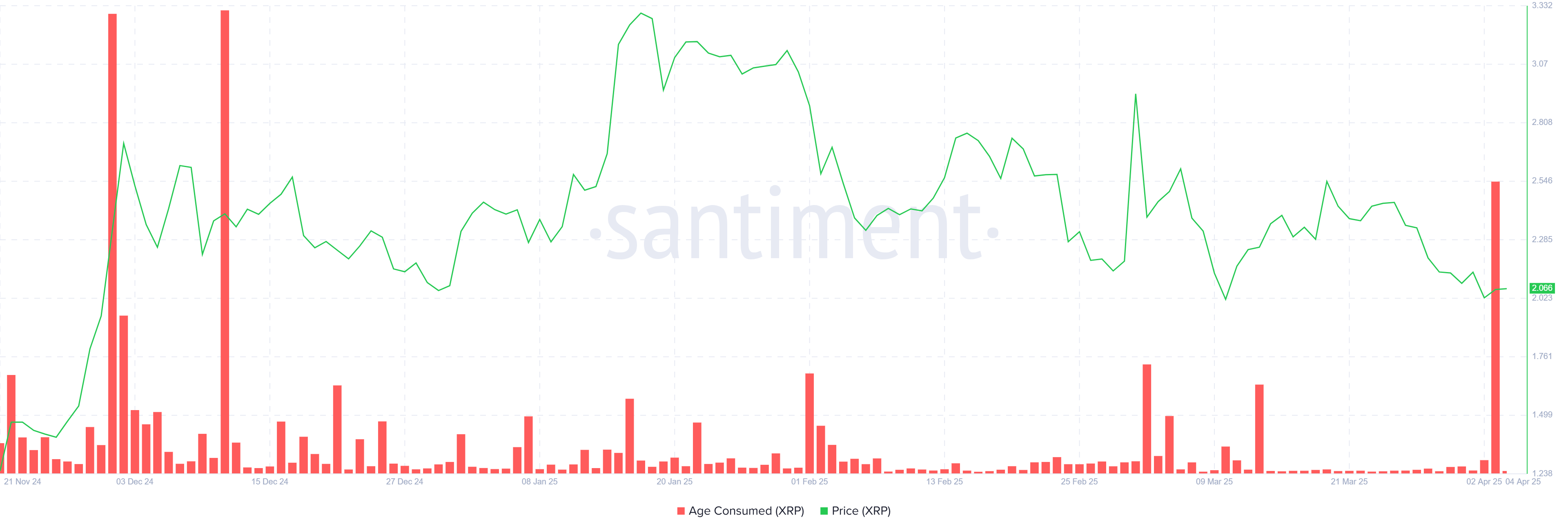 Viimeaikainen lasku XRP:n hinnassa on aiheuttanut jyrkän piikin “Age Consumed” -tunnusluvussa. Tämä indikaattori seuraa kolikoiden liikettä pitkäaikaishaltijoilta (LTH) ja on saavuttanut korkeimman tasonsa yli neljään kuukauteen. Kasvu viittaa siihen, että LTH:t, jotka ovat pitäneet XRP:tä pitkään, menettävät nyt kärsivällisyytensä.