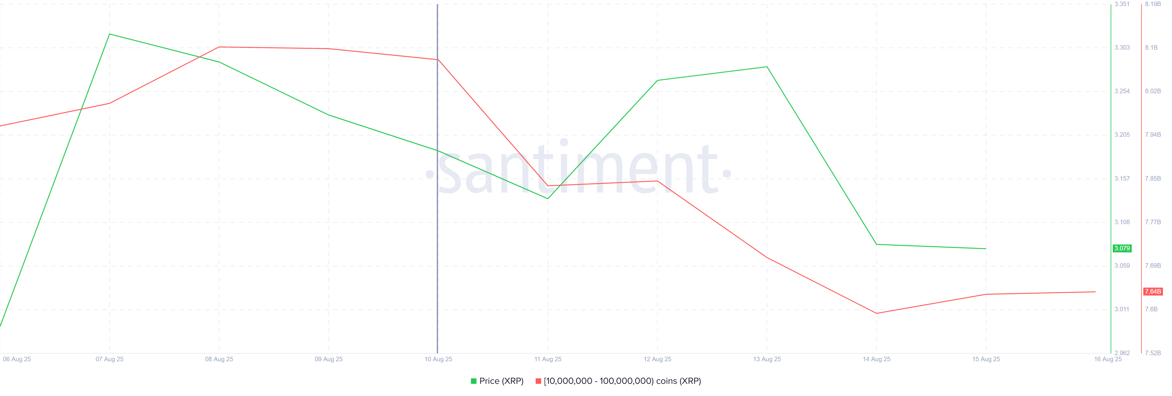 Valas-sijoittajien myyntipaine on ilmeinen, kun suuret haltijat vähentävät omistuksiaan. Viime viikon aikana osoitteet, jotka pitävät hallussaan 10 miljoonan ja 100 miljoonan XRP:n välillä, ovat myyneet noin 400 miljoonaa XRP:tä, arvoltaan yli 1,2 miljardia dollaria.