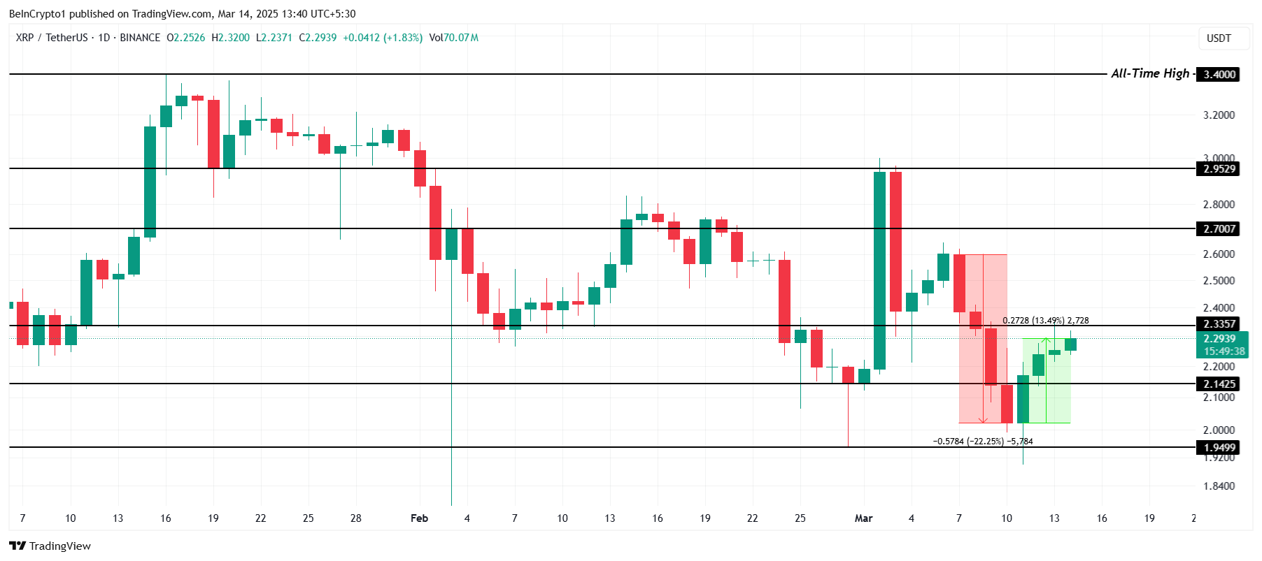 XRP:n hinta on noussut 13 % viimeisten neljän päivän aikana, ja se käy kauppaa tänään 2,29 dollarilla, palauttaen 50 % äskettäin kokemistaan 22 % tappioista. Altcoin testaa parhaillaan avainkynnystä 2,33 dollaria, joka sen on ylitettävä lisänousupotentiaalin saavuttamiseksi. Jos se onnistuu ylittämään tämän vastuksen, XRP voi nousta kohti 2,70 dollaria, palauttaen täysin viimeaikaiset tappionsa ja nostaen hintaa entisestään.