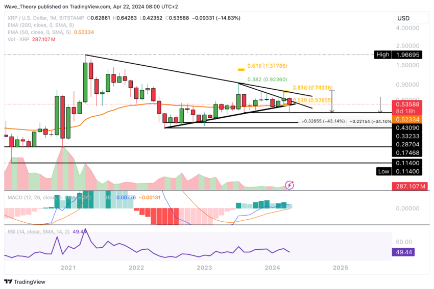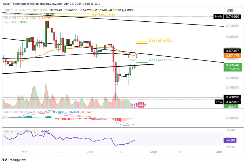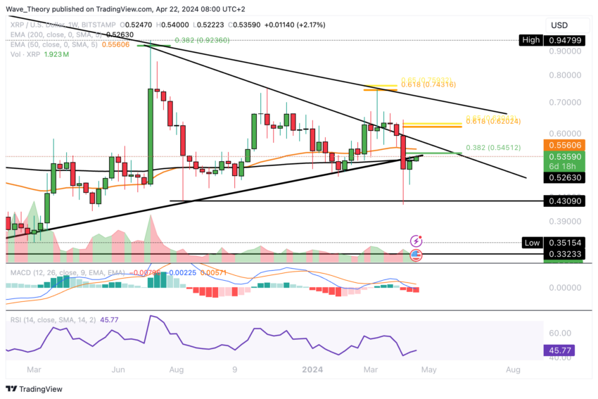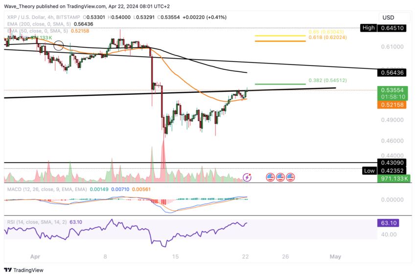 Ripple kohtaa merkittäviä Fibonacci-vastustasoja noin 0,545 ja 0,62 dollaria. Läpimurto kultaisen suhteen vastuksen yläpuolella 0,62 dollarissa merkitsisi Ripplen korjausvaiheen päättymistä, mikä mahdollisesti palauttaisi nousutrendin. Ripple voisi tähdätä lisävastukseen noin 0,75 dollarissa tällaisessa skenaariossa.