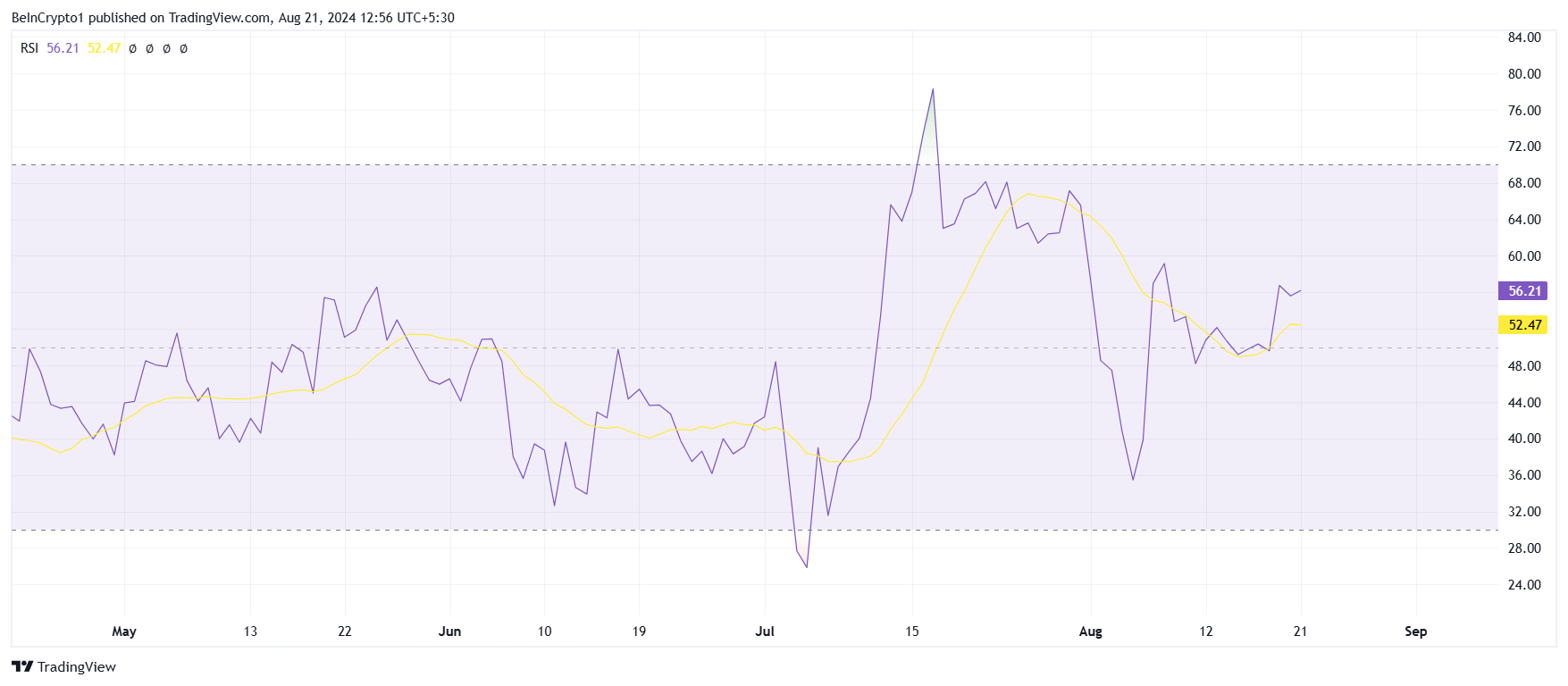 XRP:n hinta on ja saattaa jatkossakin hyötyä sijoittajien positiivisesta käyttäytymisestä. Altcoinin suhteellinen vahvuusindeksi (RSI) on vakiintunut vahvasti härkäalueelle, pysyen neutraalin viivan yläpuolella. Tämä sijoittelu osoittaa vahvaa ja aktiivista ostovoimaa markkinoilla, vihjaillen, että kauppiaat ovat luottavaisia XRP:n nykyiseen suorituskykyyn.