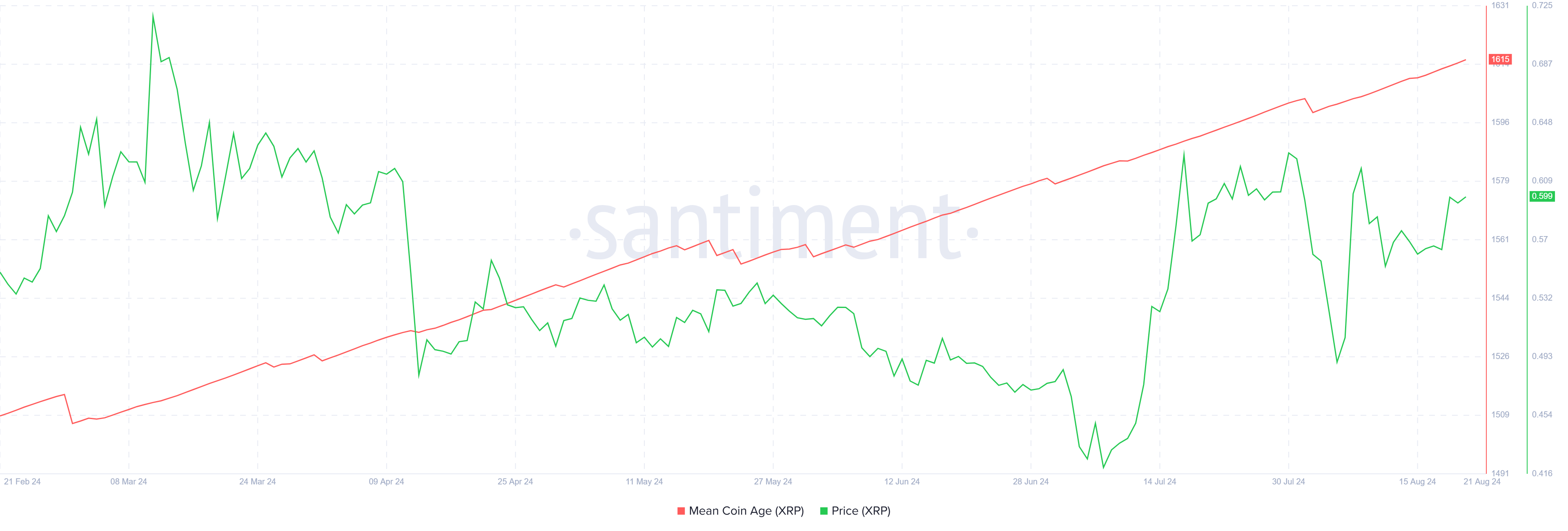 Lisäksi härkämäisen RSI:n lisäksi XRP:n keskimääräinen kolikkoikä (MCA) on osoittanut jatkuvaa nousua, vaikka markkinoilla on ollut korjauksia. Nouseva MCA viittaa siihen, että pitkäaikaiset haltijat ylläpitävät asemiaan, osoittaen vahvaa uskoa omaisuusvaran potentiaaliin.