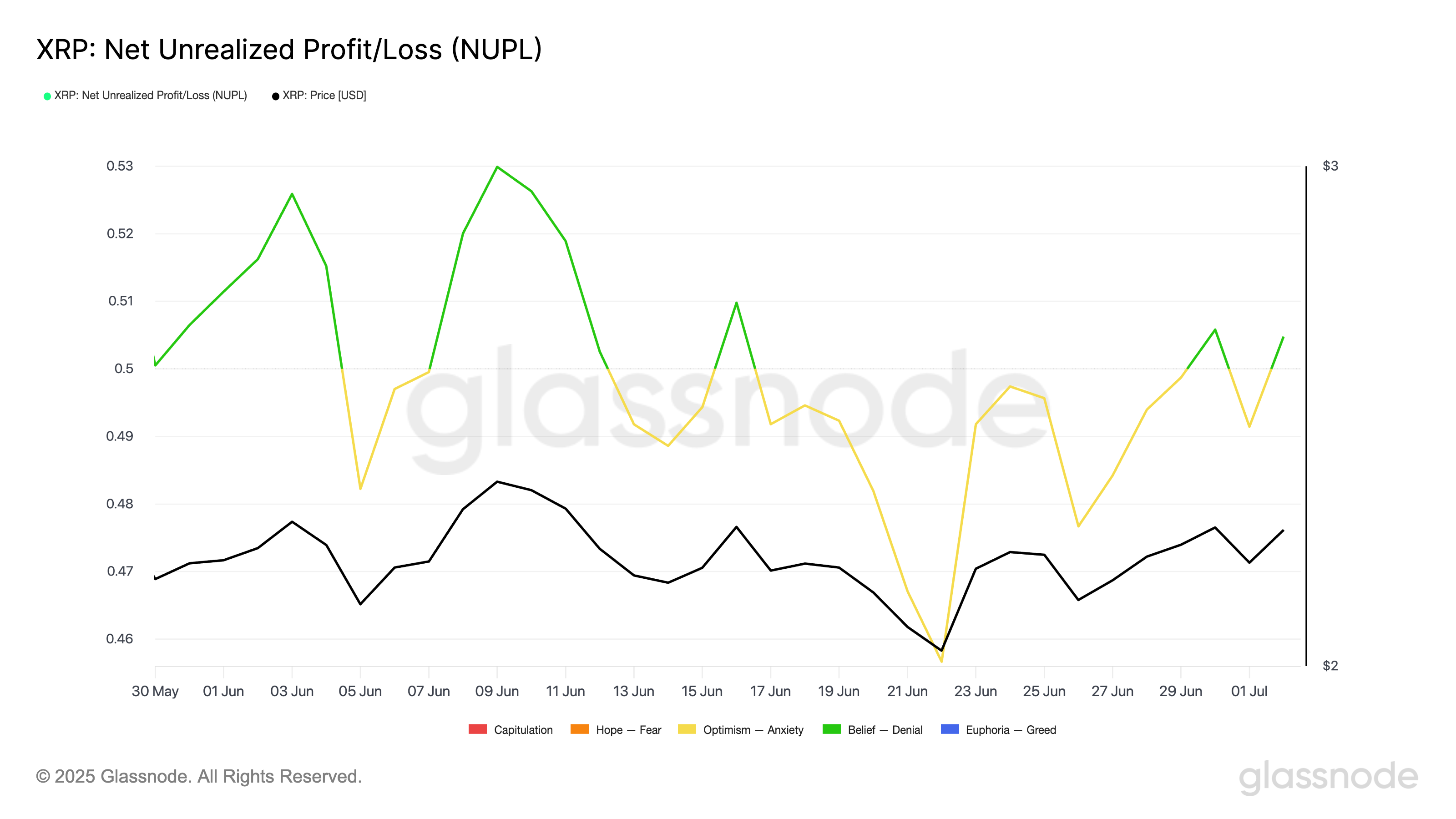 Lohkoketjun data heijastaa XRP:n sivuttaista hintakehitystä, mikä osoittaa markkinaosapuolten puuttuvan vakaumuksen. Glassnoden mukaan altcoinin Net Unrealized Profit/Loss (NUPL) osoittaa, että XRP:n sijoittajien tunnelma on vaihdellut “Optimismi–Ahdistus” ja “Usko–Kieltäminen” -alueiden välillä viimeisen kuukauden aikana.
