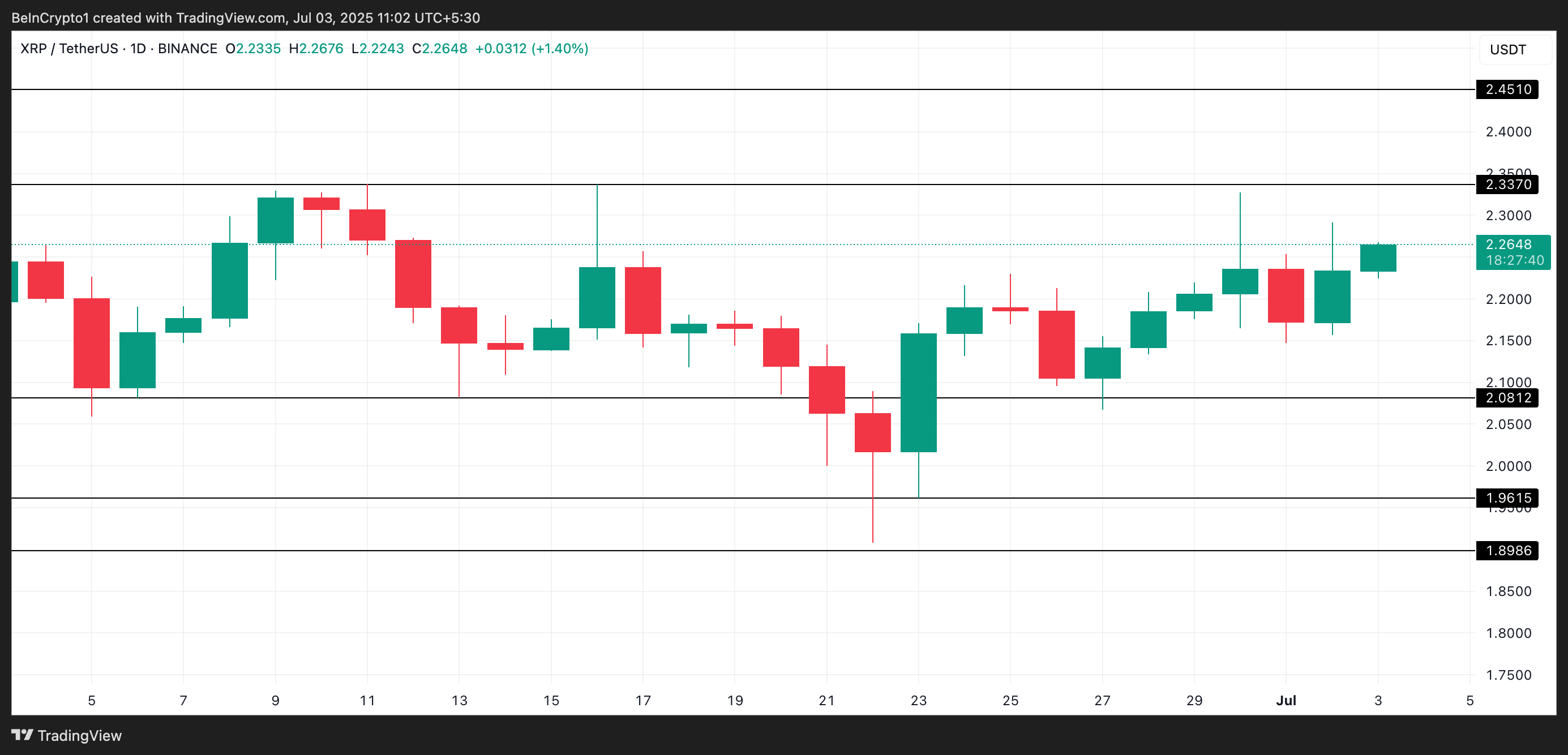 Toisaalta, jos karhut vahvistavat hallintaansa, ne voivat painaa XRP:n hinnan alle 2,08 dollarin ja kohdistaa 1,96 dollariin.