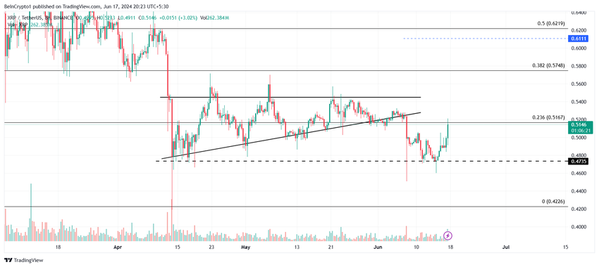 XRP:n hinta, jonka arvo on kirjoitushetkellä 0,51 dollaria, on 23,6 %:n Fibonacci Retracementin rikkomisen partaalla. Tämä linja tunnetaan myös karhumarkkinoiden tukilattiana, ja sen kääntäminen tueksi voisi tarjota XRP:lle jonkin verran helpotusta uusiin laskuihin.