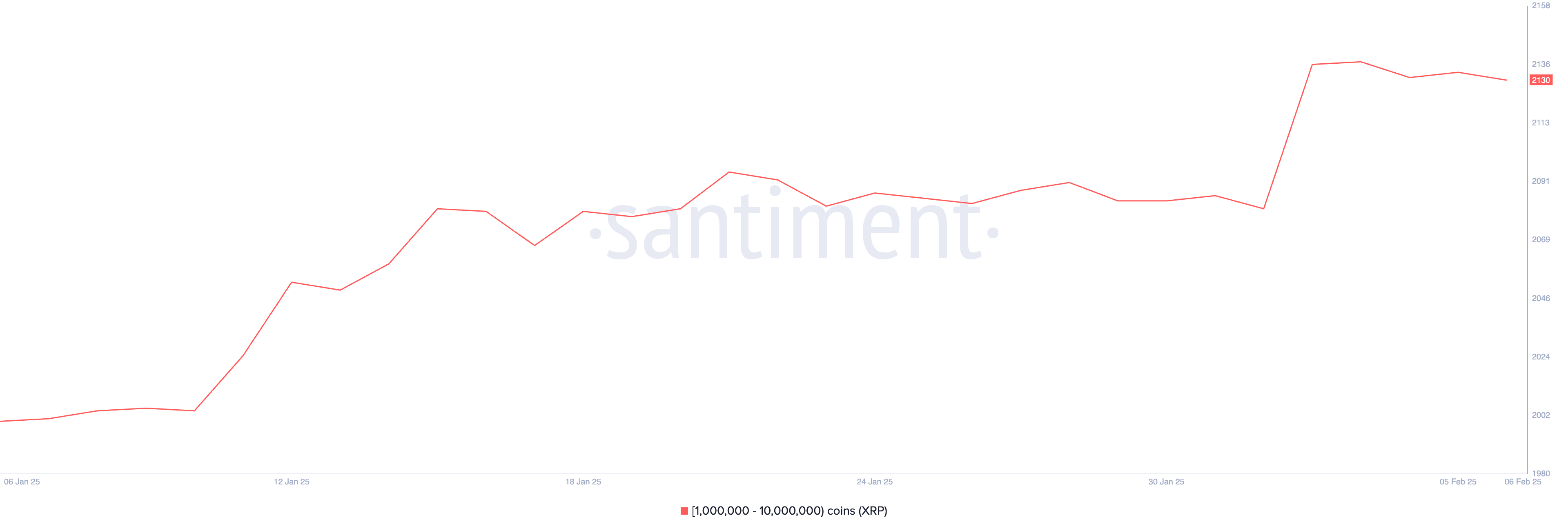 XRP-valaita – osoitteita, jotka pitävät hallussaan 1 000 000 – 10 000 000 XRP:tä – on tällä hetkellä 2130. Tämä luku nousi 2081:stä 2136:een helmikuun 1. ja 2. päivän välillä, mikä osoittaa voimakkaan keräilyvaiheen ennen hidasta laskua.