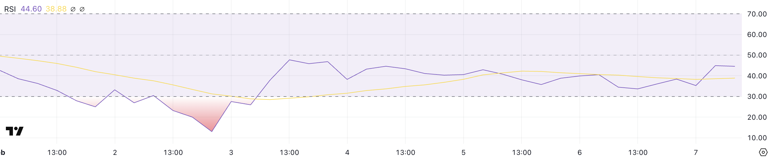 XRP:n Relative Strength Index (RSI) on noussut 35,2:sta 44,6:een vain muutamassa tunnissa, mikä heijastaa tunnelman muutosta viimeaikaisen heikkouden jälkeen. Nousu viittaa kasvavaan ostokiinnostukseen, vaikka XRP pysyy neutraalilla alueella.